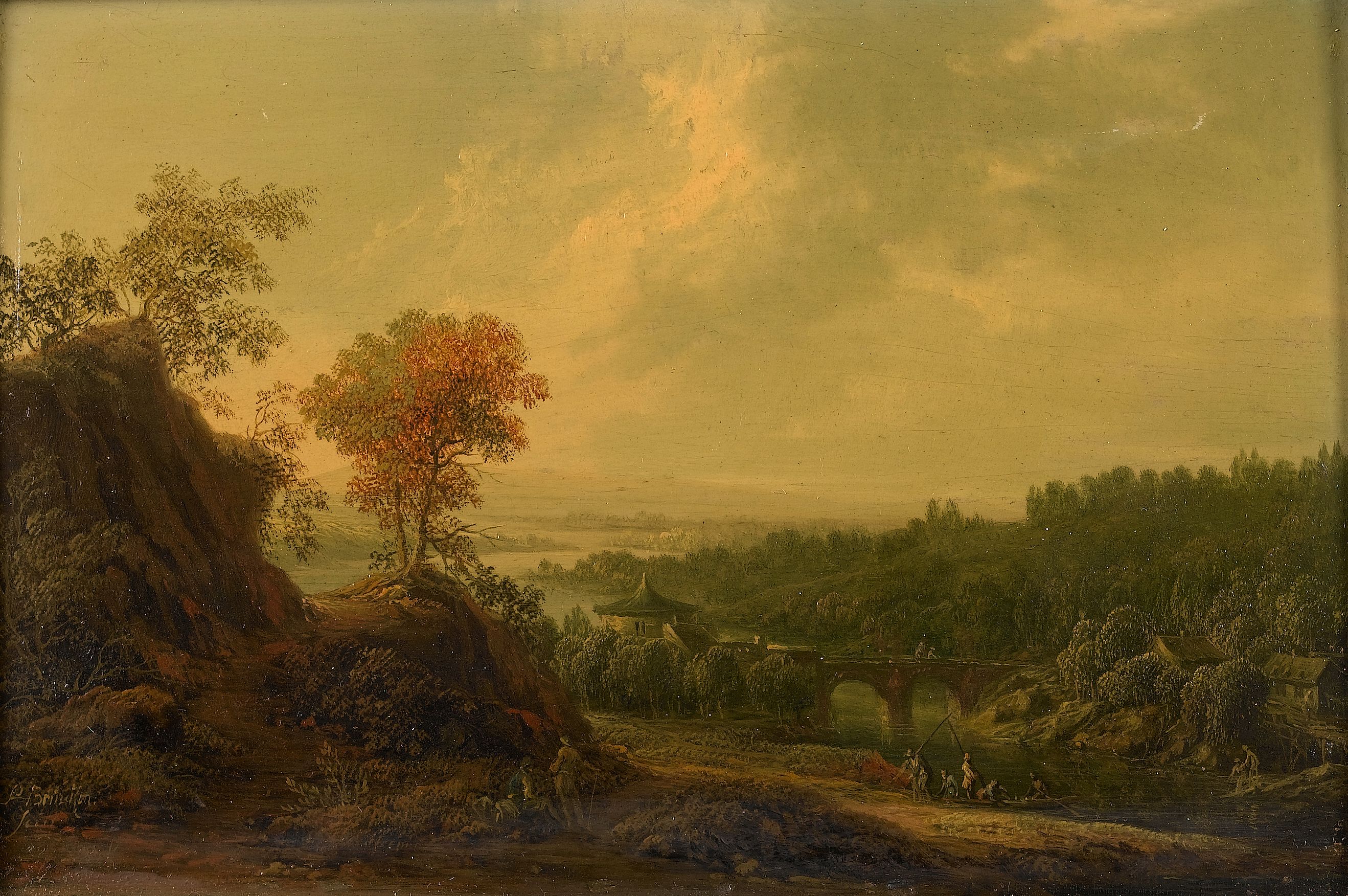 Figures and a horse and cart on the banks of a river