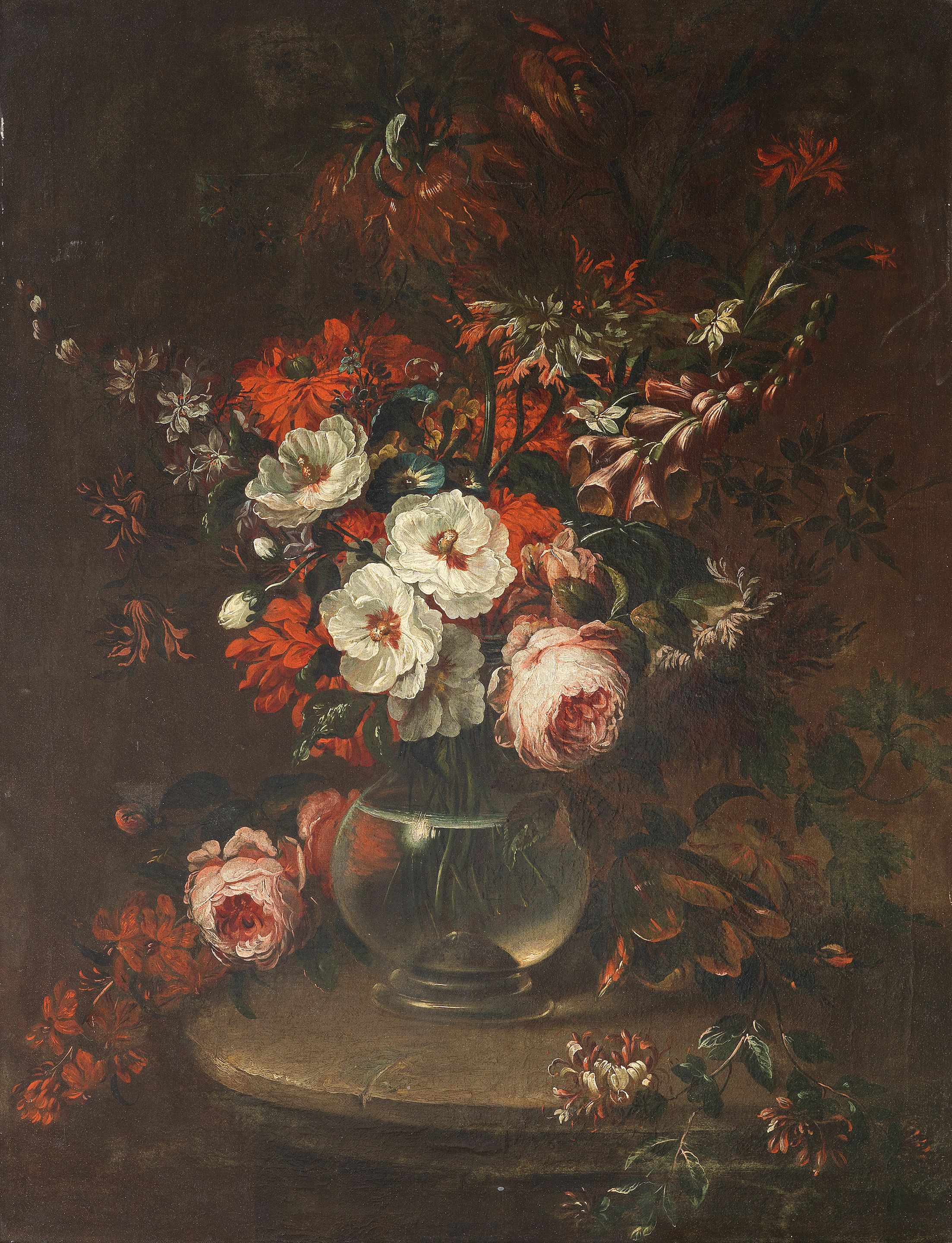 Roses, tulips, poppies, a sunflower and other flowers in a glass vase on a stone ledge
