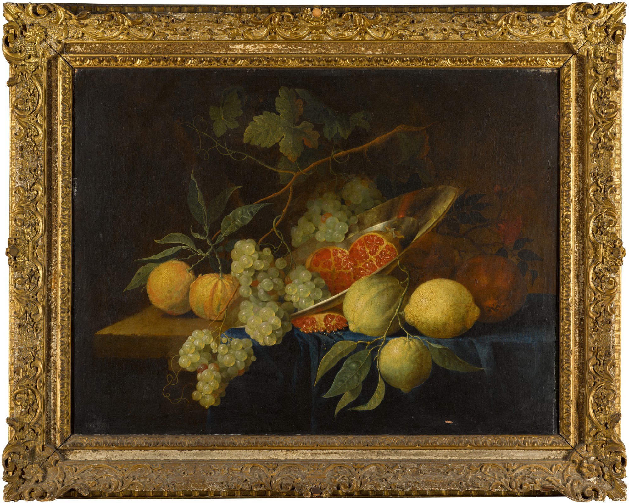 Still life with pomegranates in a pewter dish, with lemons, oranges and grapes all on a draped stone ledge