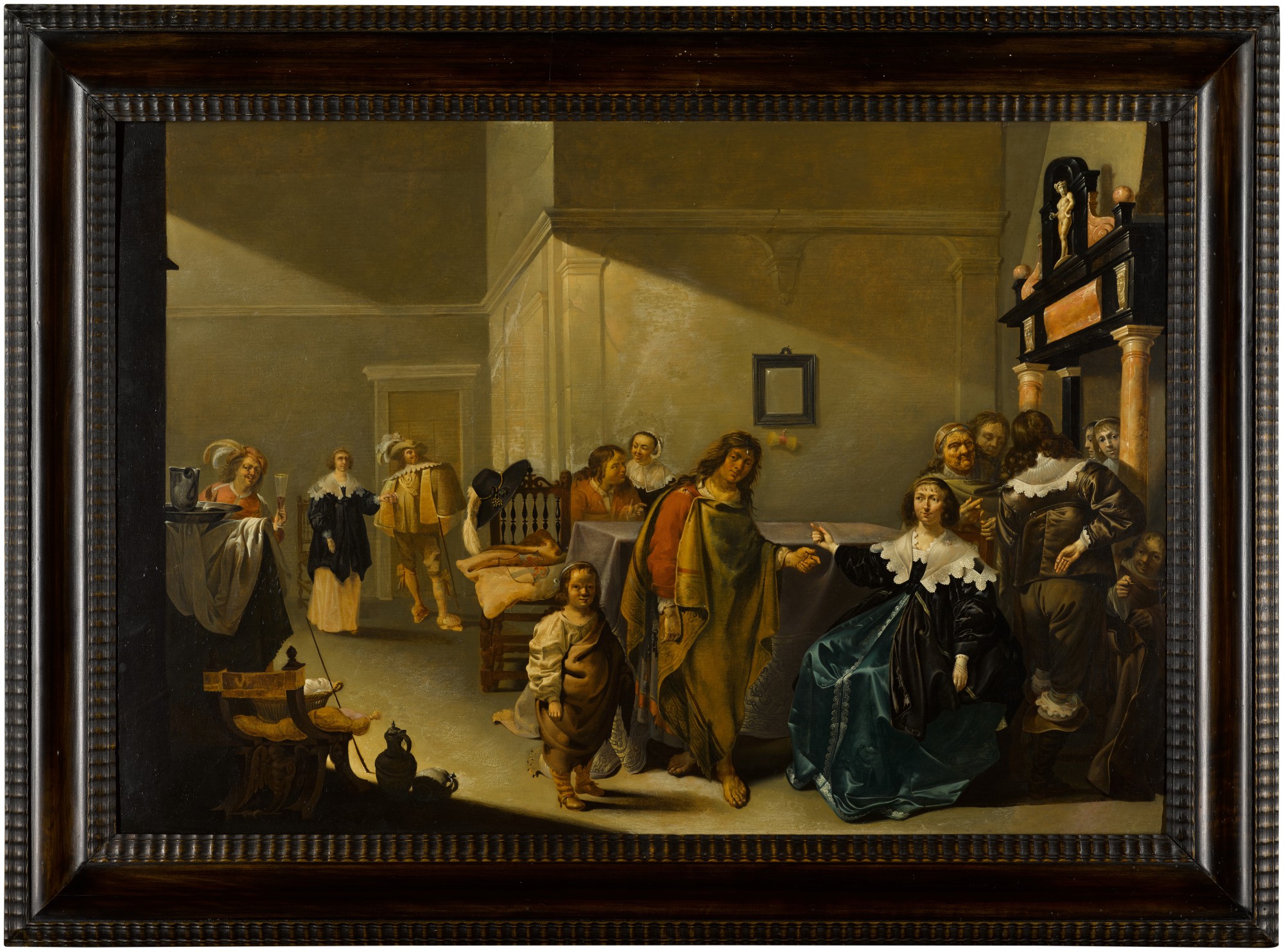 Interior with elegantly-dressed figures and a fortune teller with her retinue
