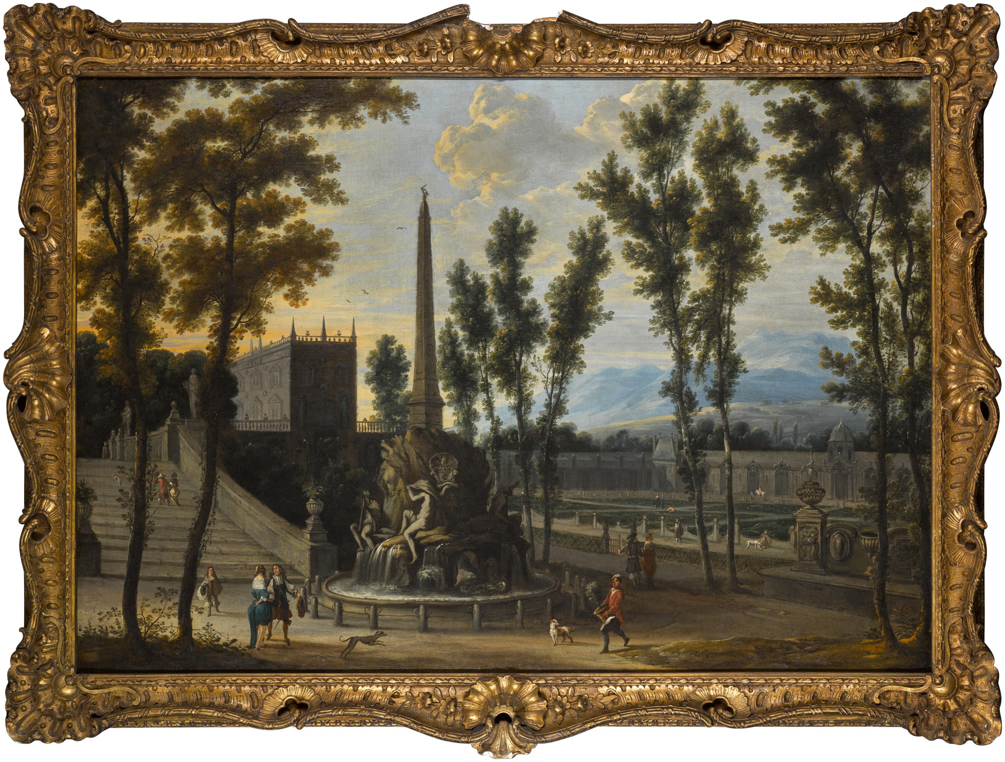 A capriccio of an Italianate palatial garden with figures beside Gian Lorenzo Bernini's fountain of The Four Rivers