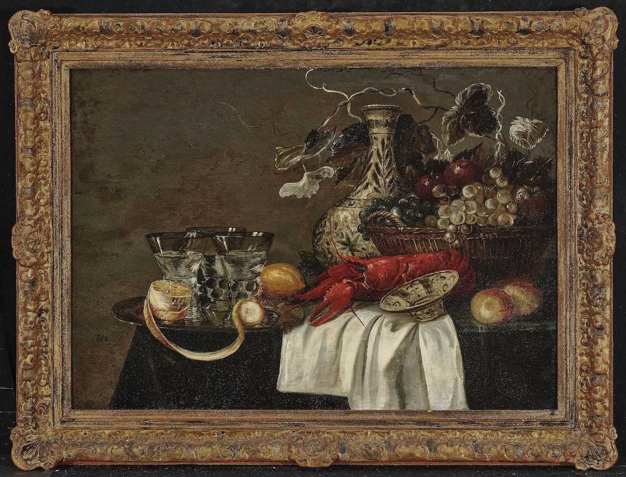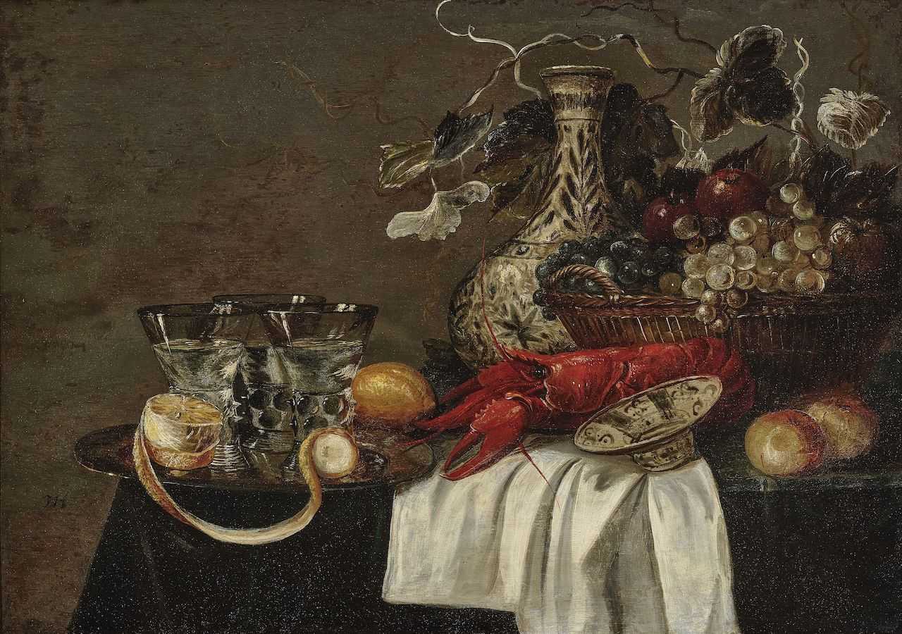 Monogrammist JH. Still life with lobster, fruits and glasses
