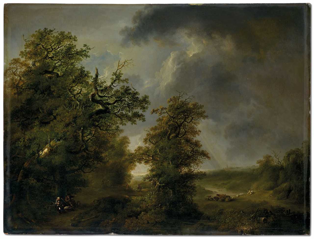 Bewaldete Flusslandschaft mit Bauersleuten und Kühen im Regensturm