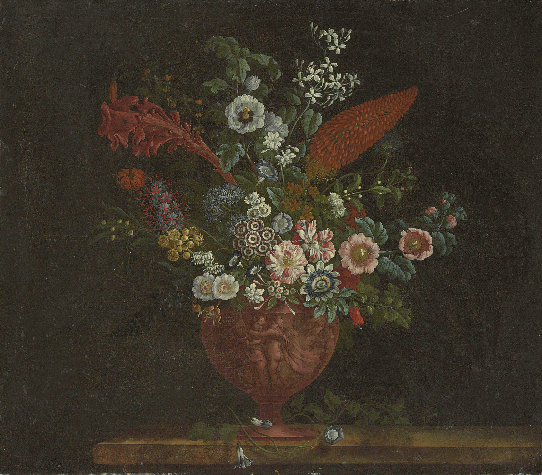 Cock's comb, foxglove, passion-flower, rose and other flowers in a sculpted terracotta urn
