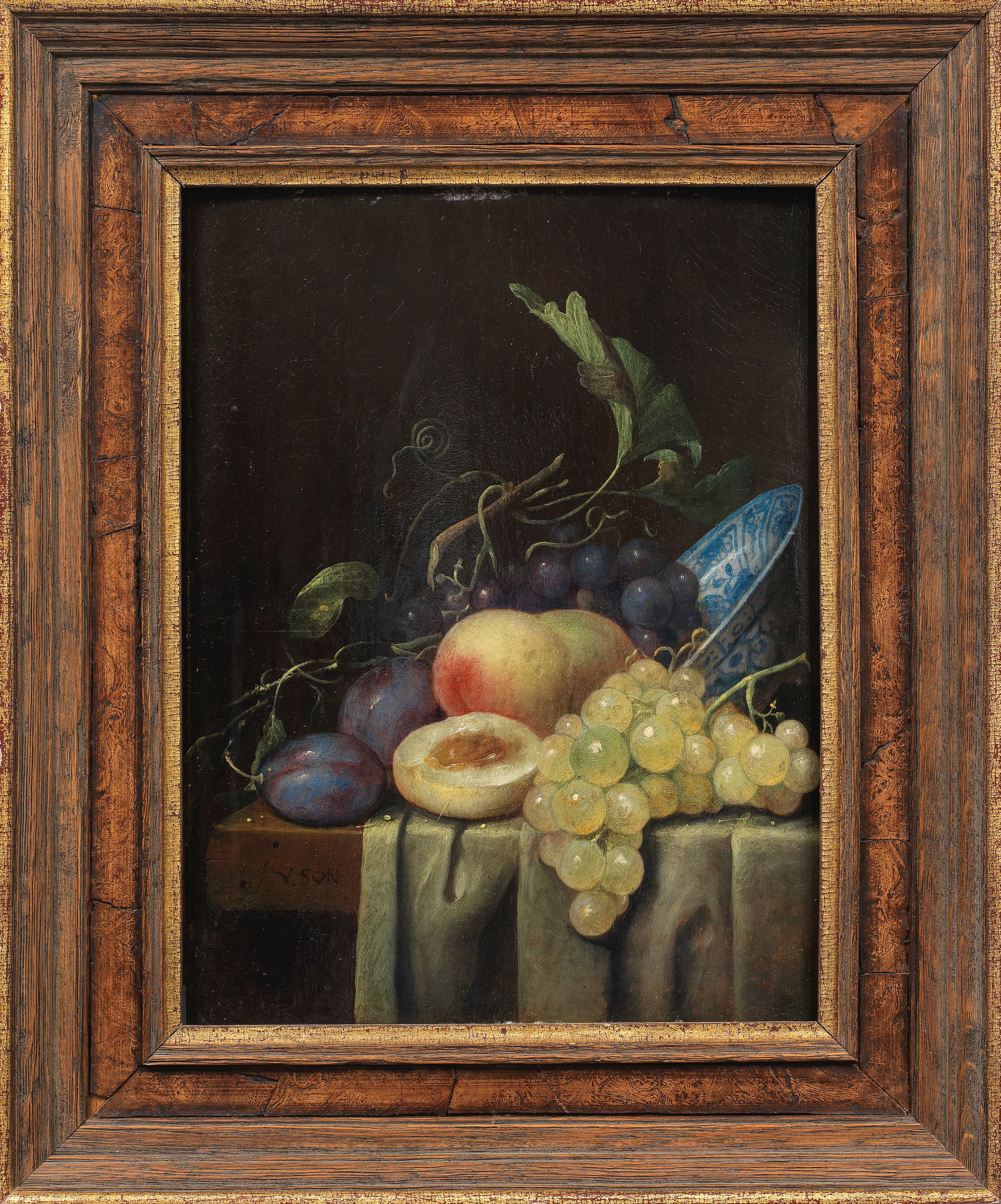 Peaches, grapes and plums with a wanli kraak bowl on a draped tabletop