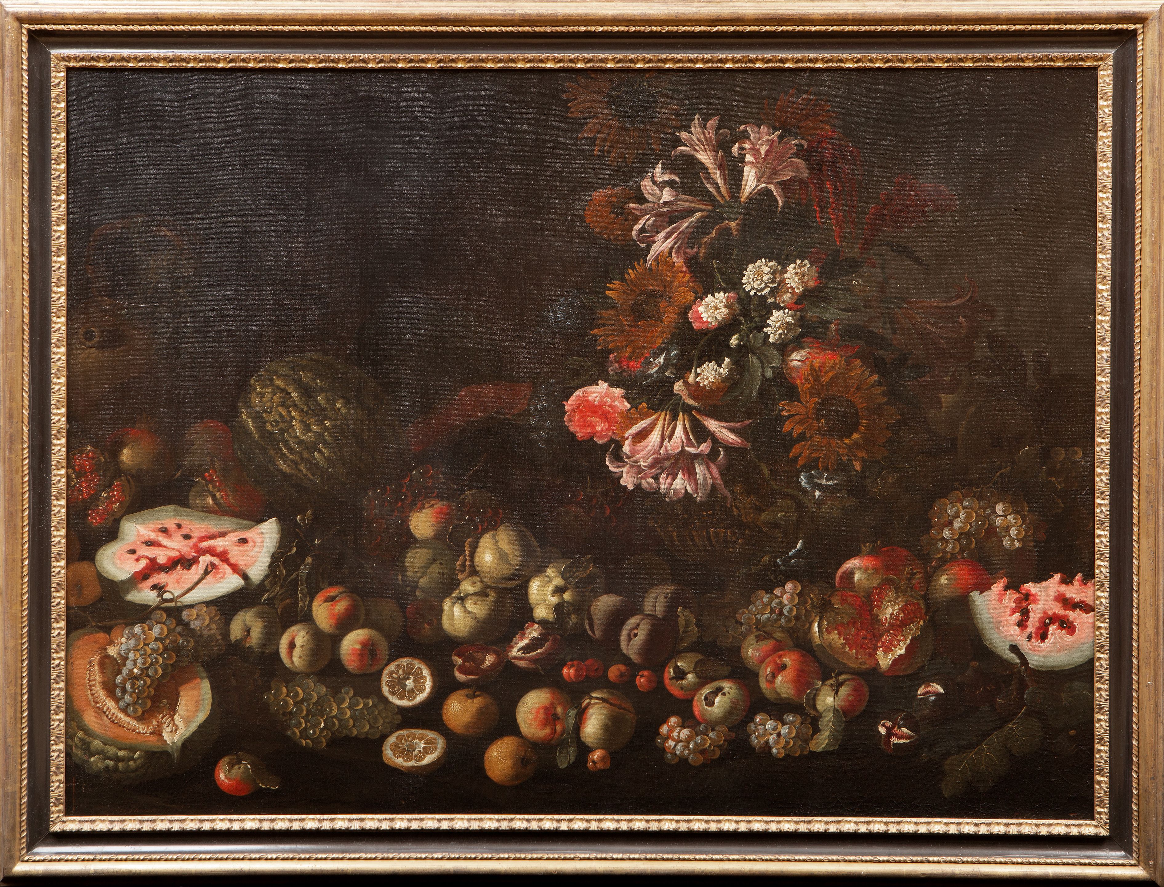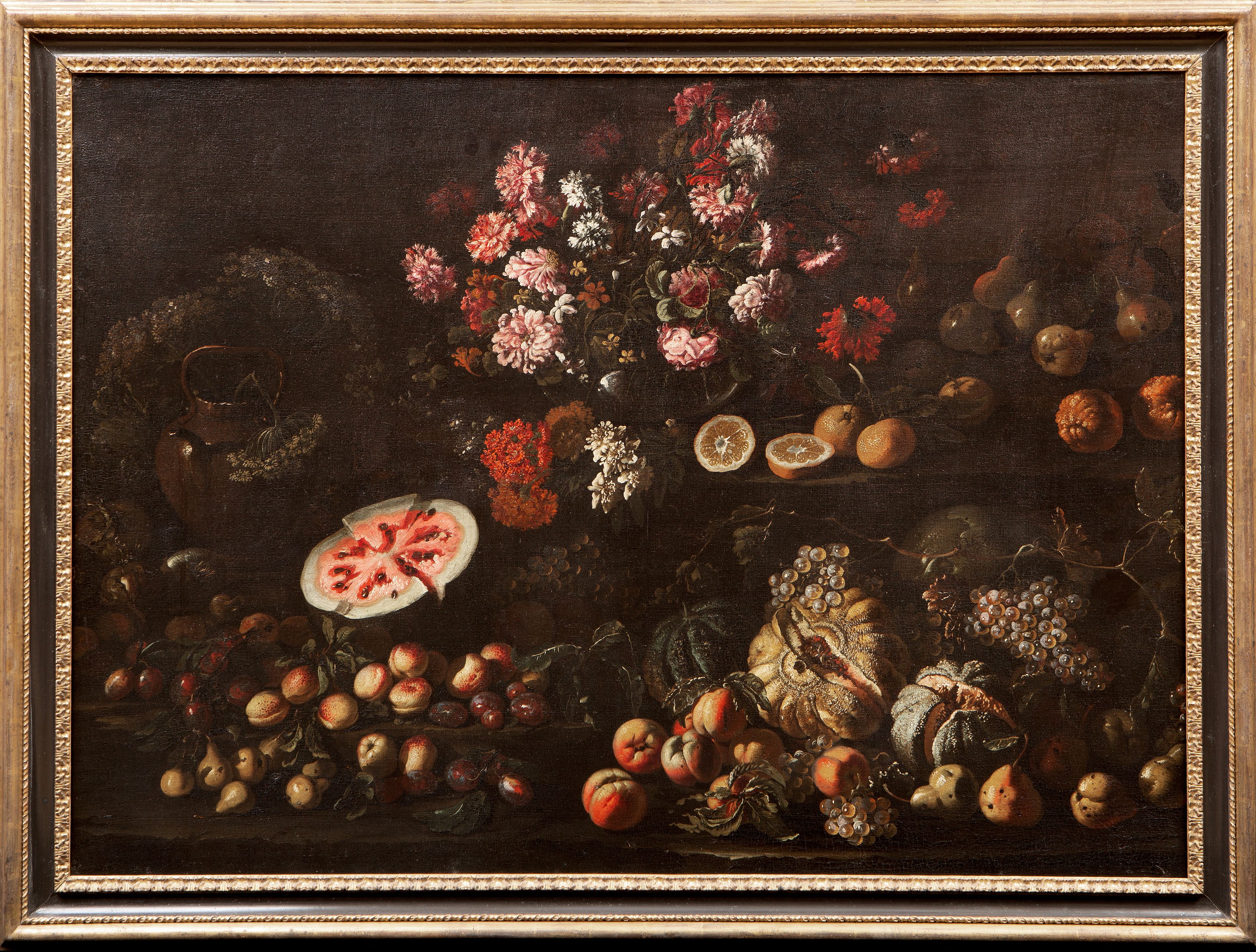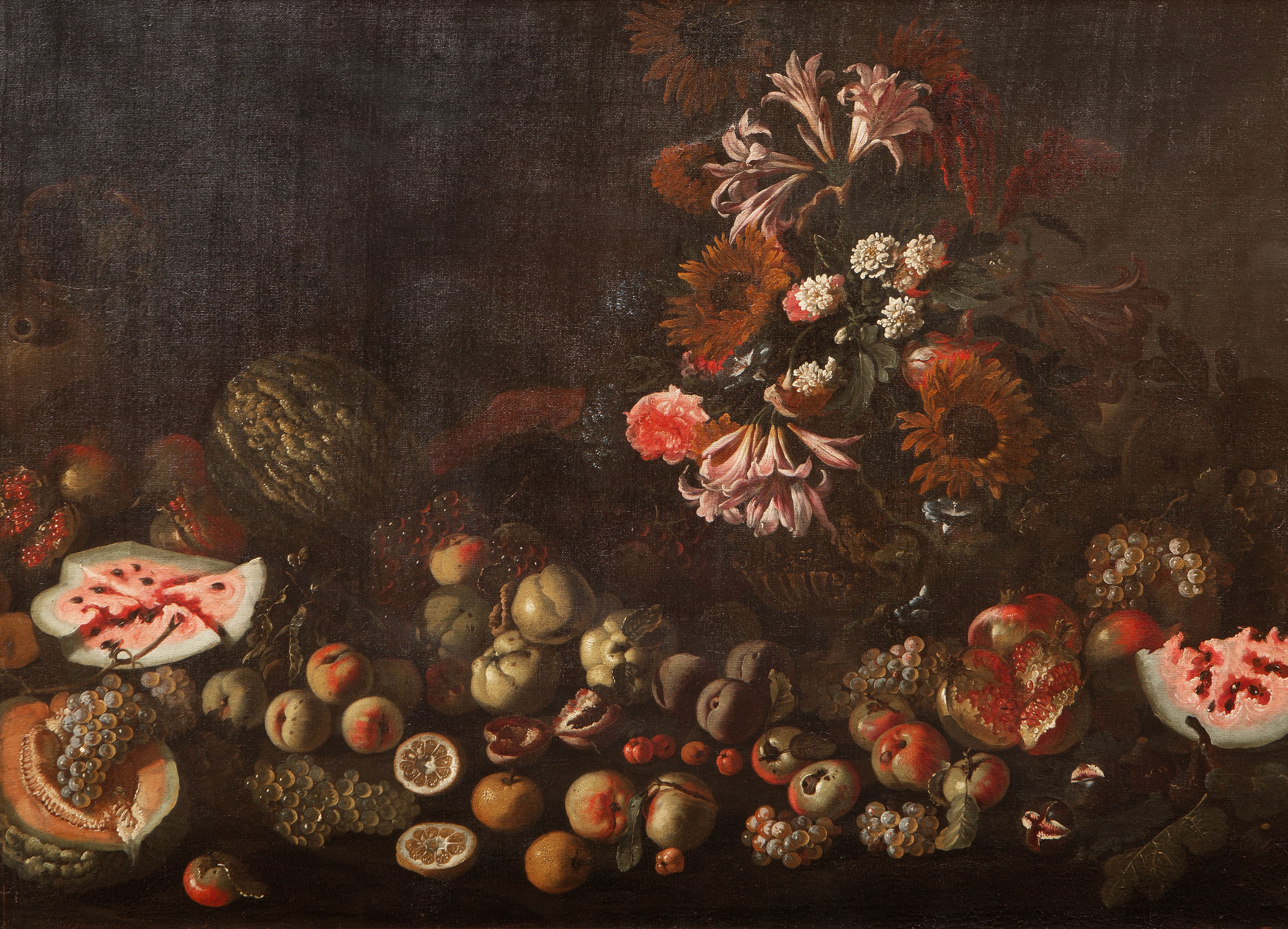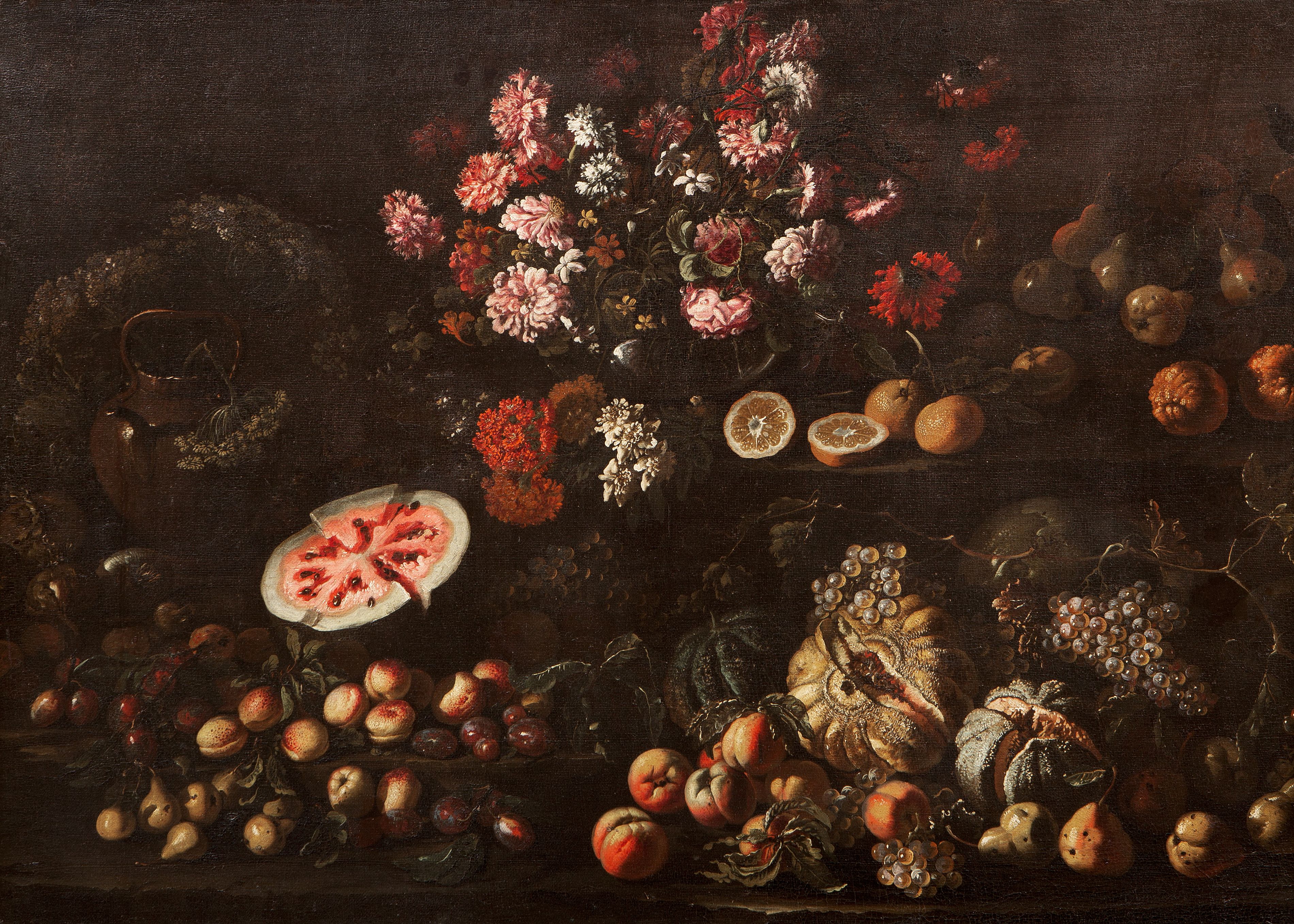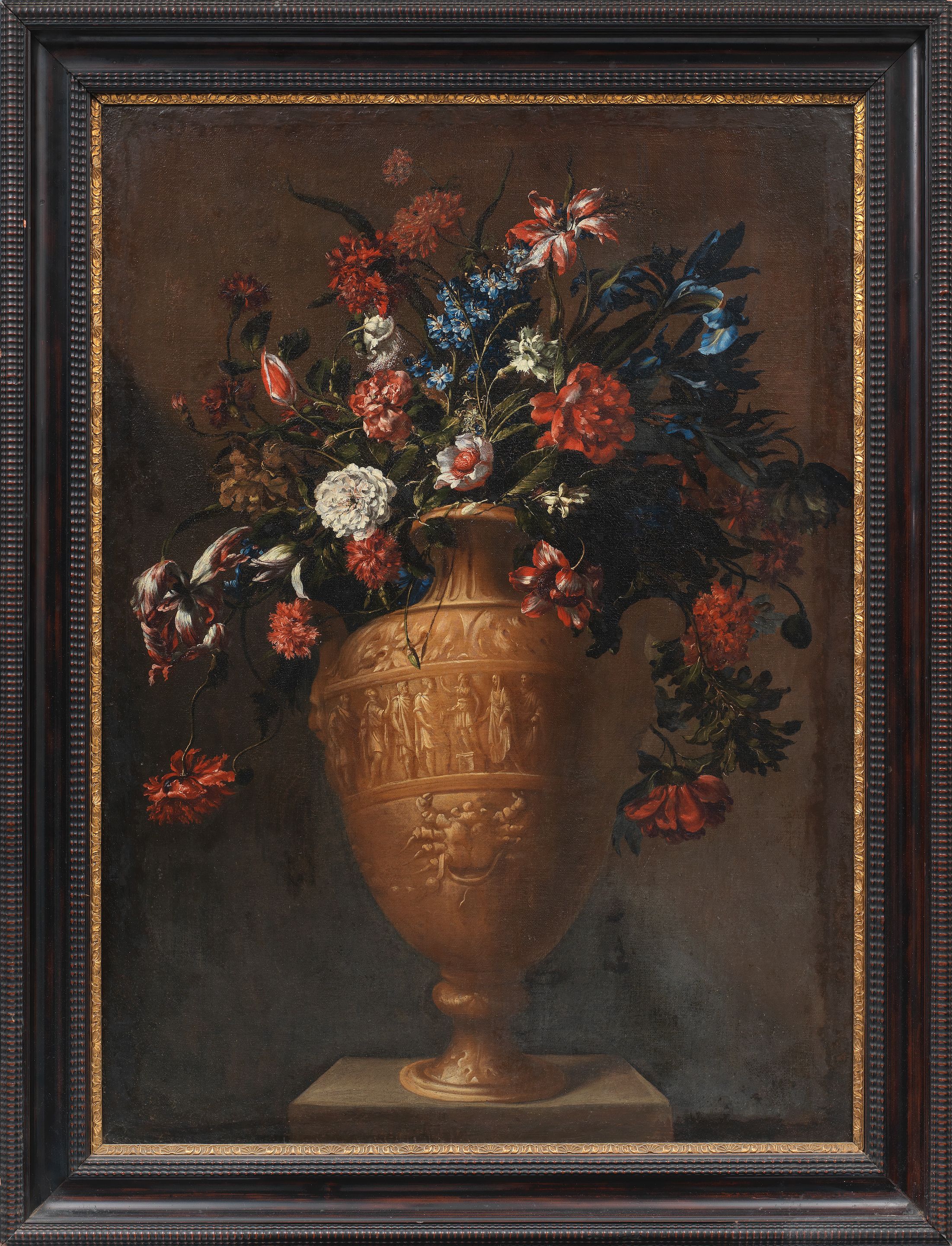 Tulips, narcissi, roses and other flowers in a glass vase on a table-top with a jewellery box and a pocketwatch