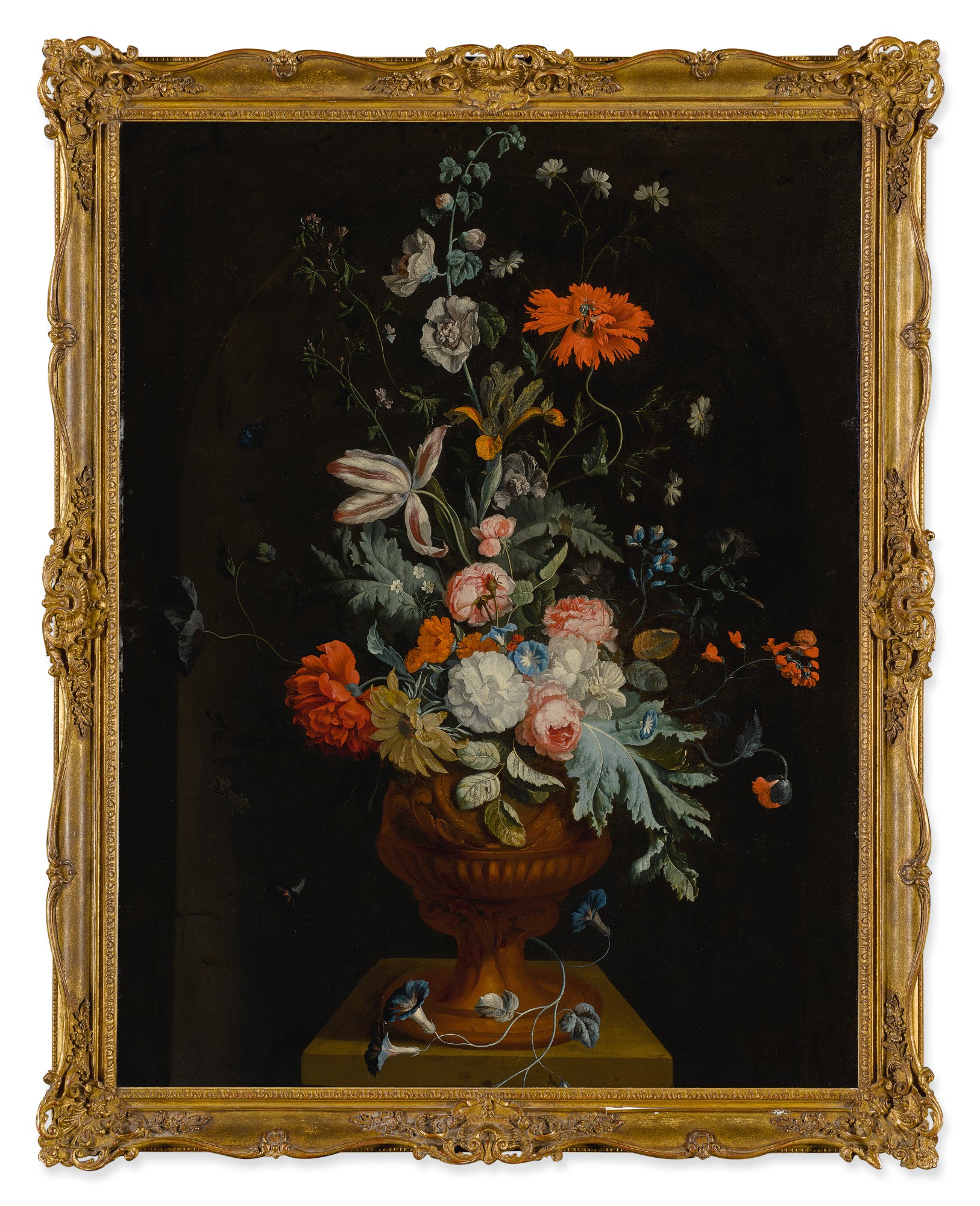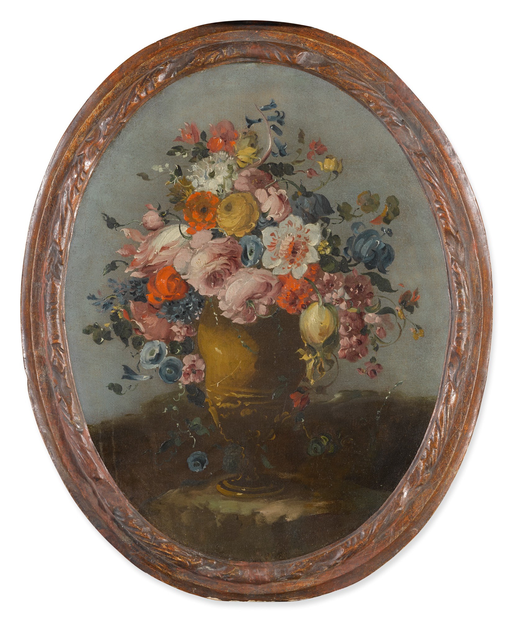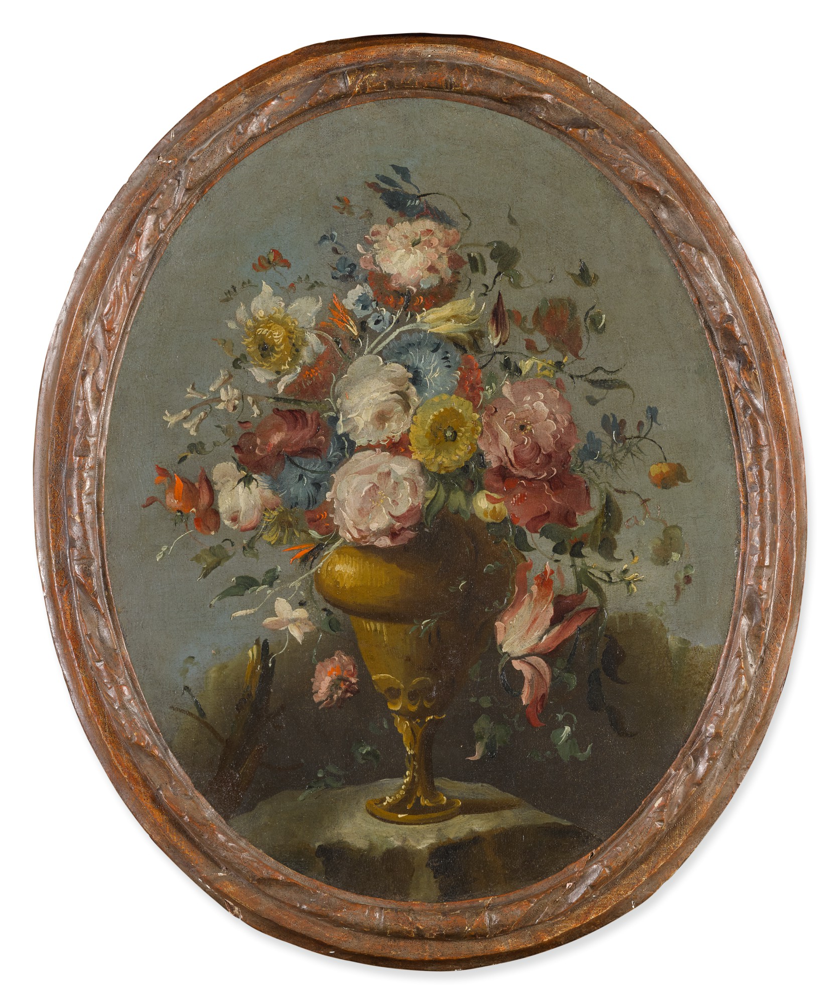 A pair of still lifes of roses, anemones, and other flowers in bronze urns, resting on stone ledges