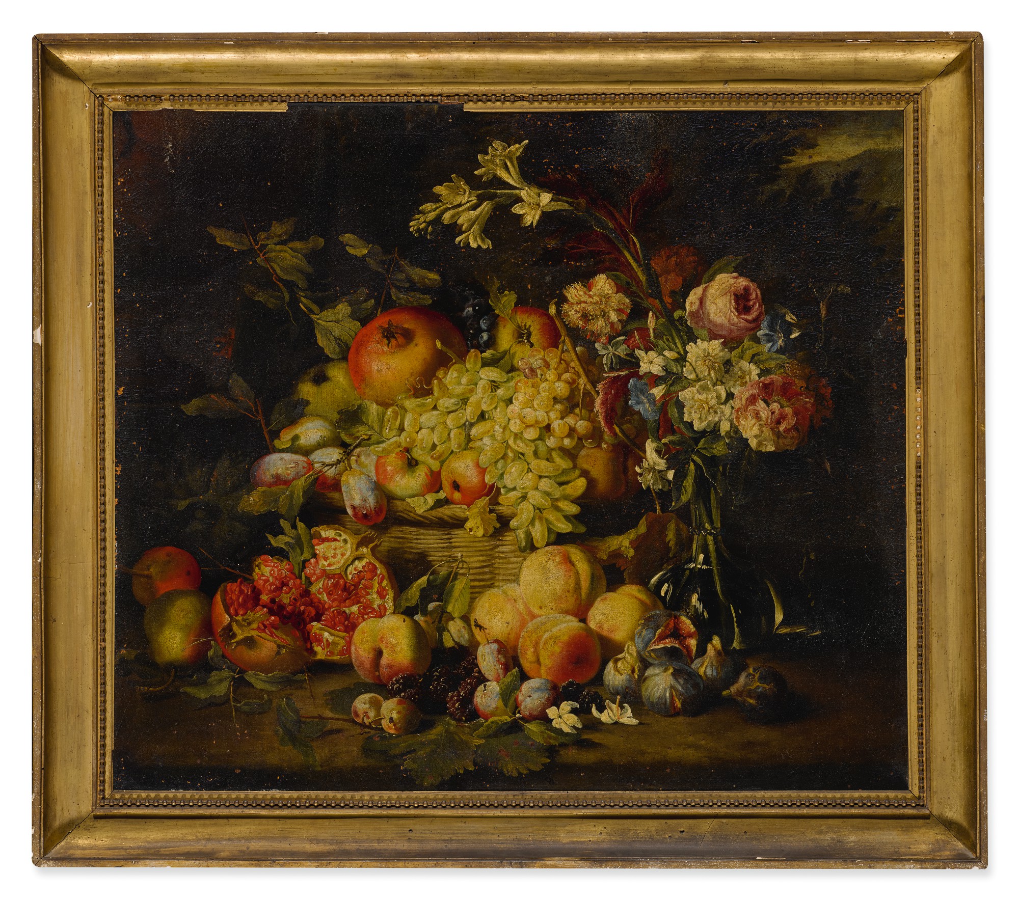 Still life of flowers and fruits, including pomegranates, peaches, and grapes