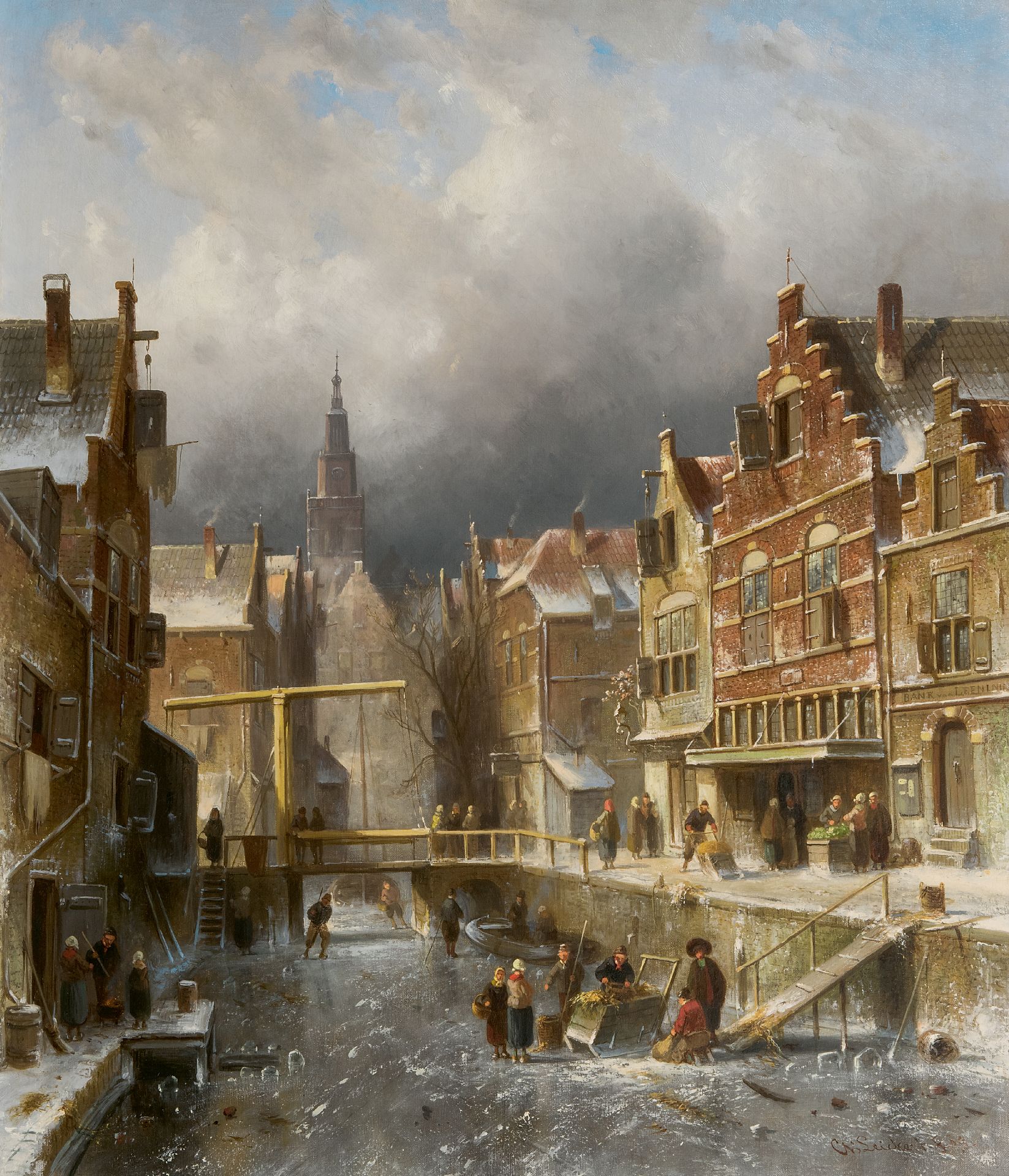 Still life with flowers, fruit and a bird's nest on a marble plinth