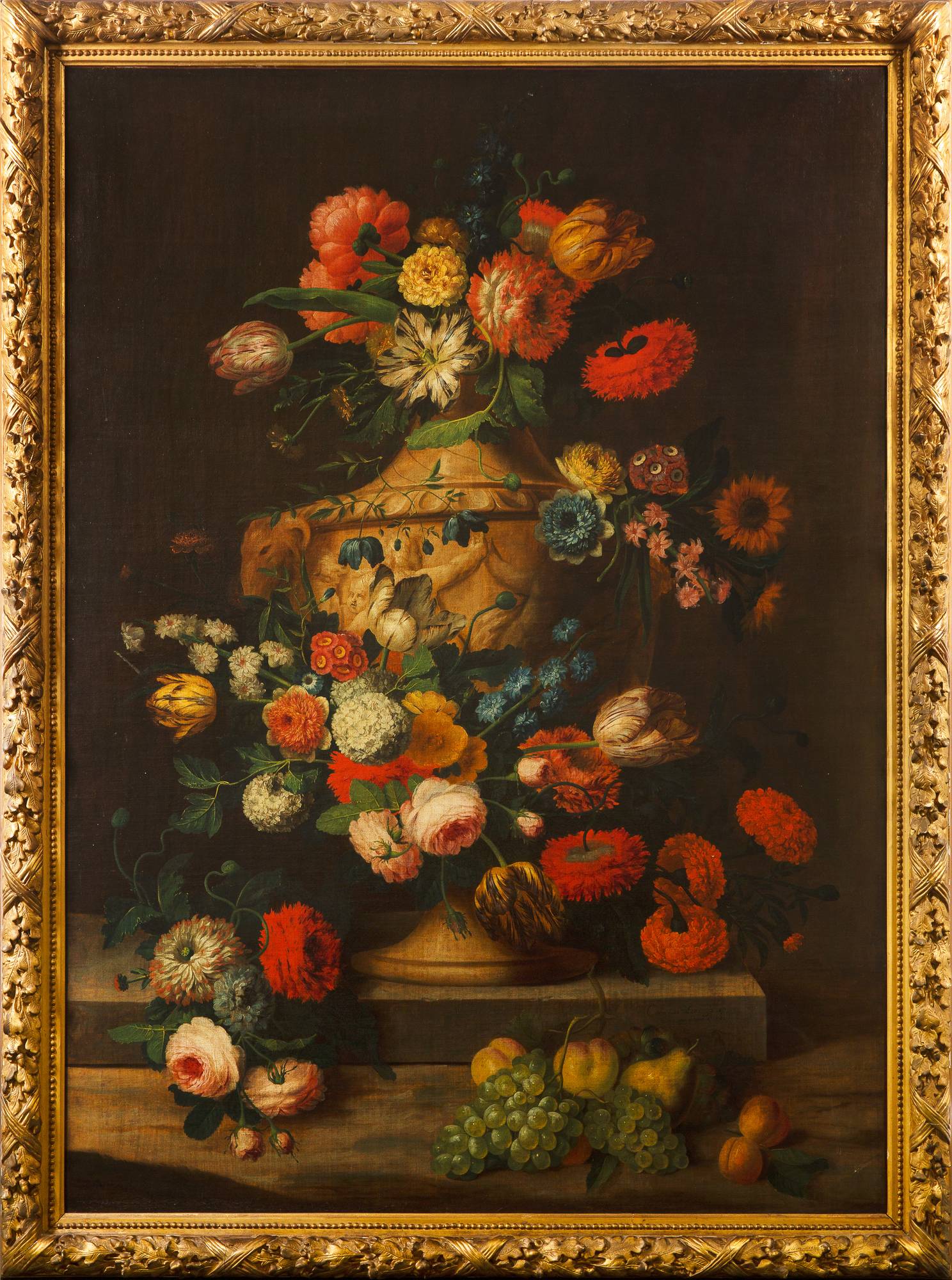Still Life with Baluster Vase with Tulips, Chrysanthemums, Sunflowers, and Other Flowers, with Apricots, Pears and Grapes, 1740