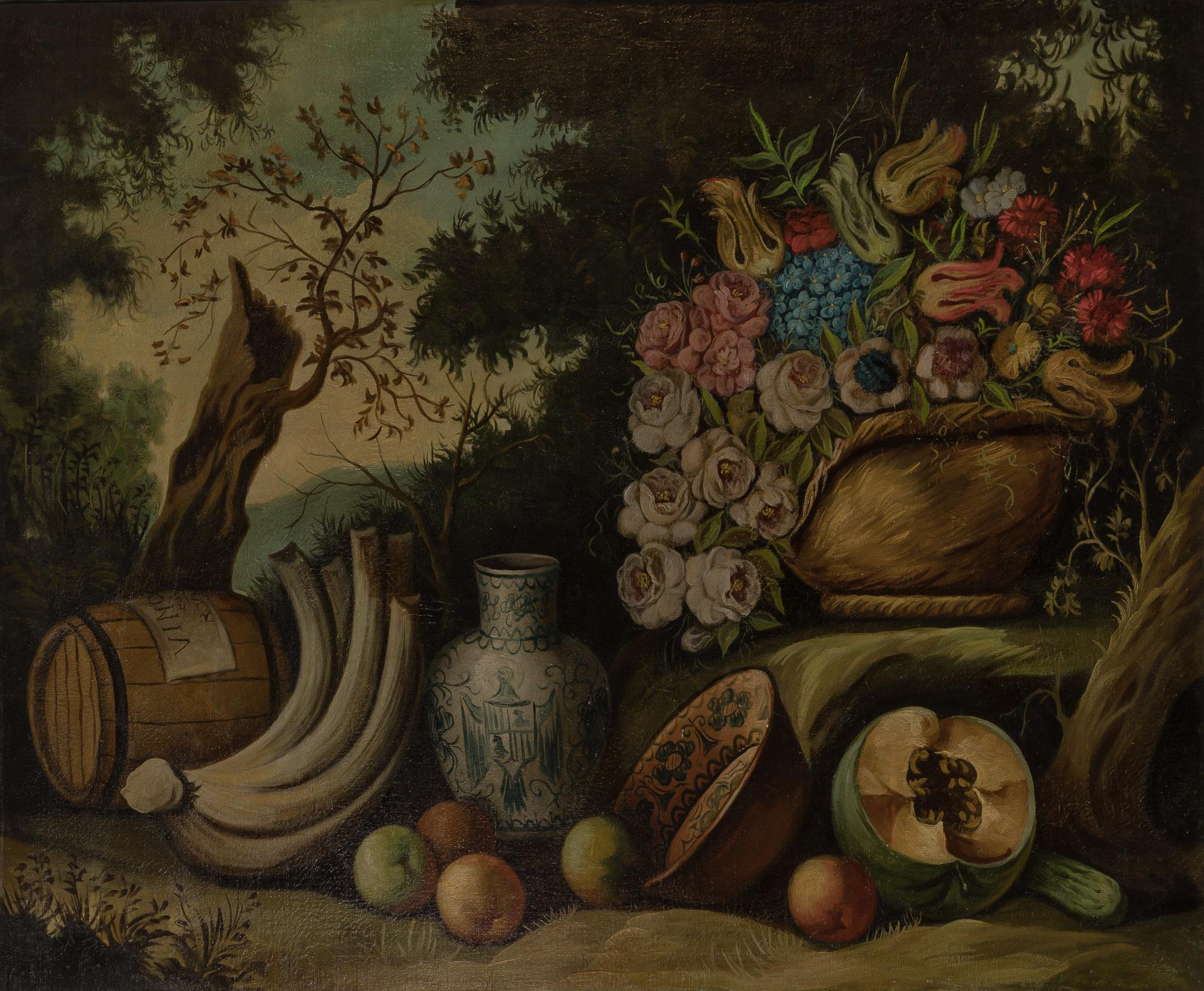 Still Life of Fruit, Vegetables and Flowers in a Landscape