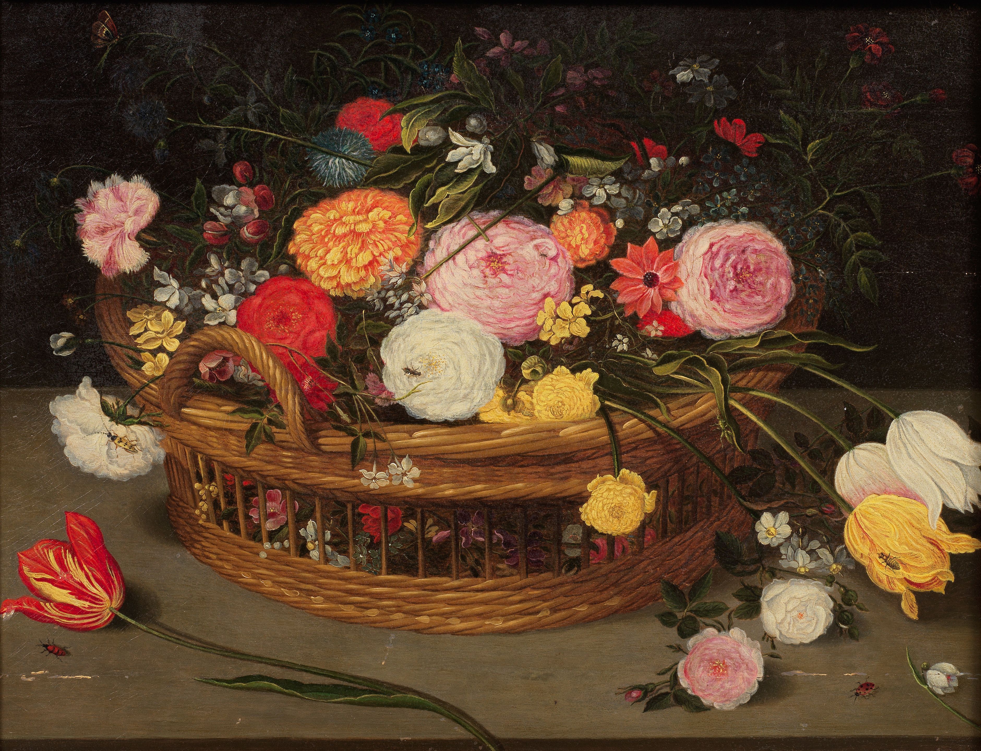 A still life of a wicker basket filled with roses, carnations and narcissi, with tulips on a table-top