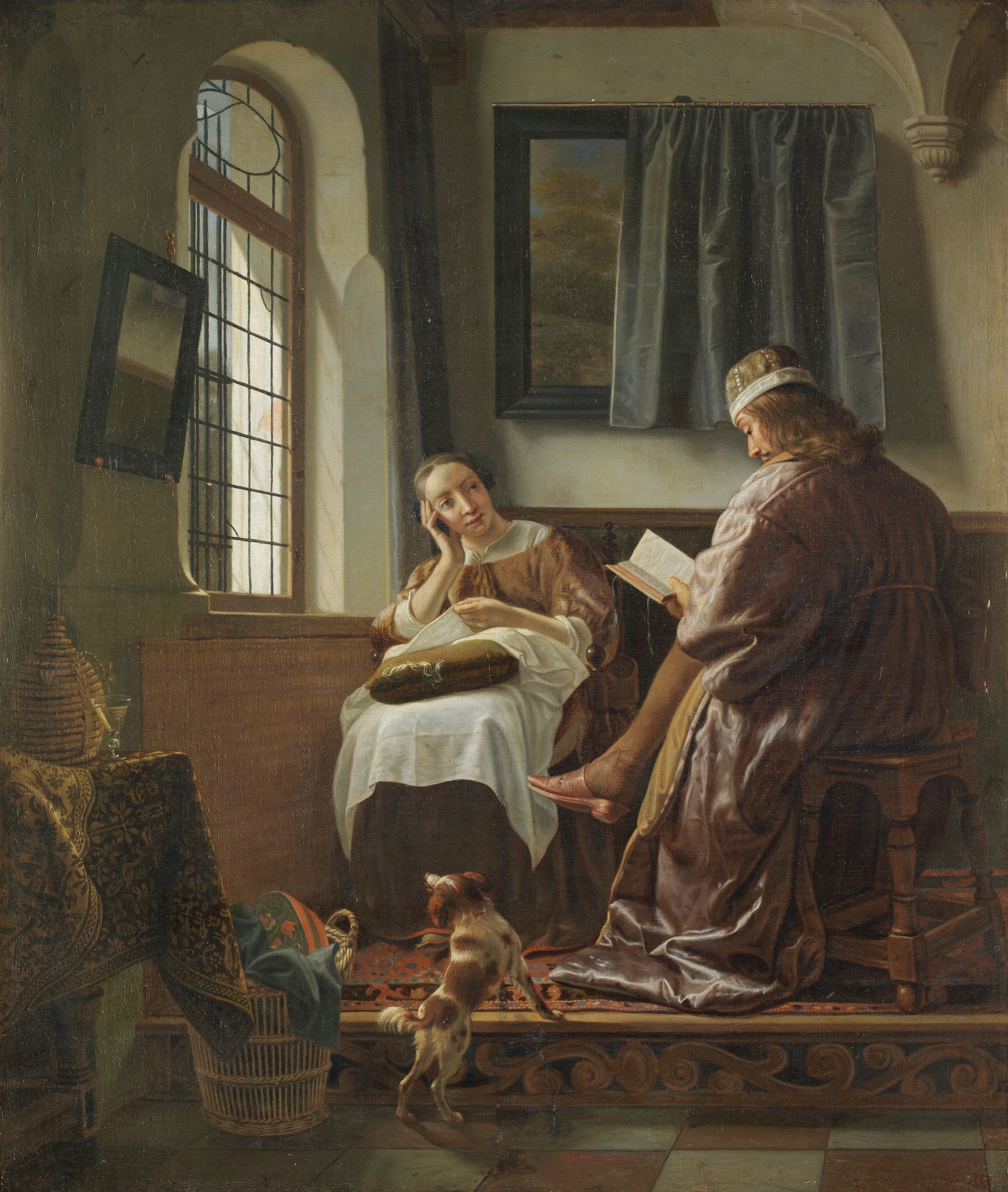A lady sewing and a gentleman reading in an interior