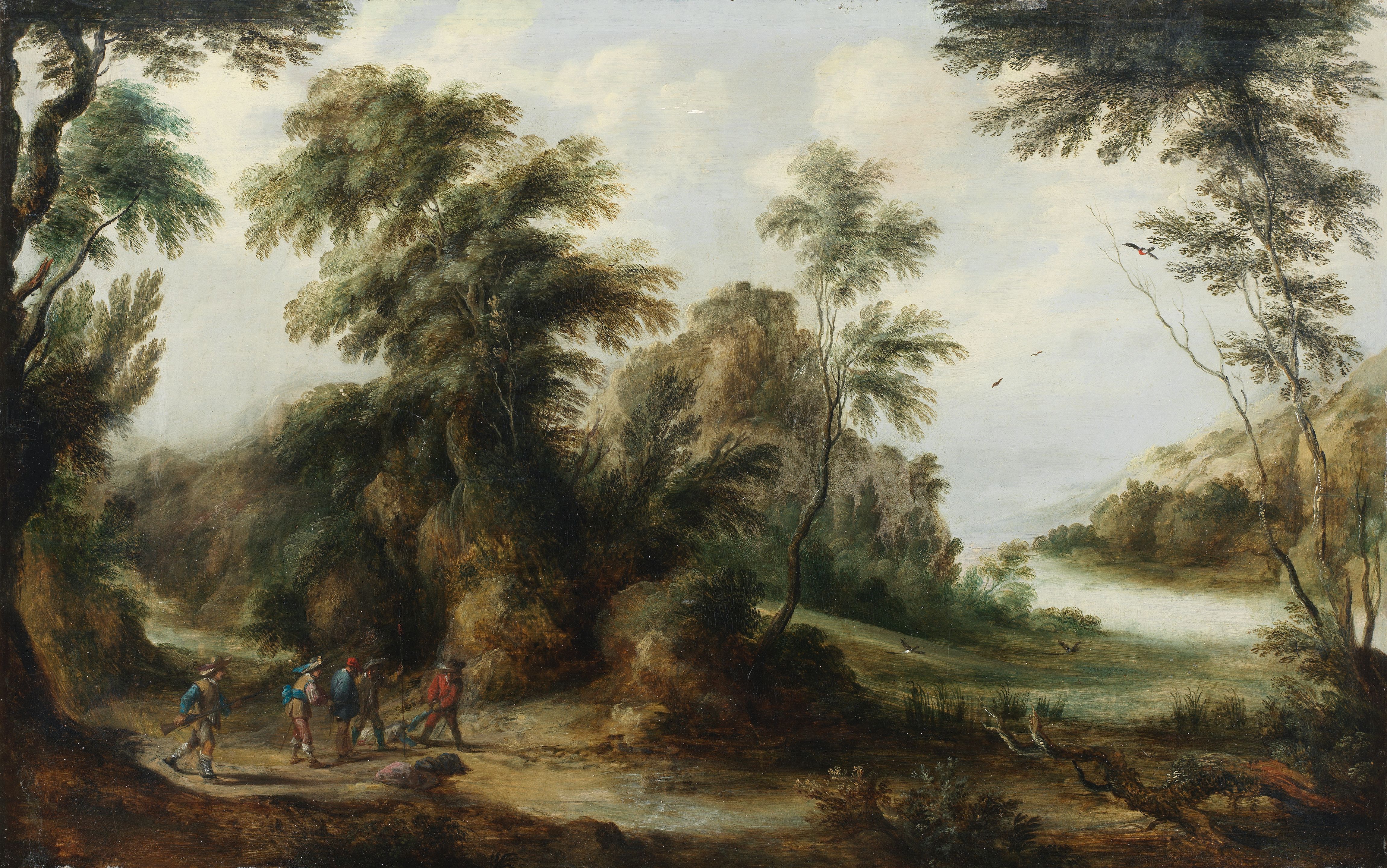 Figures in a wooded landscape, a village beyond