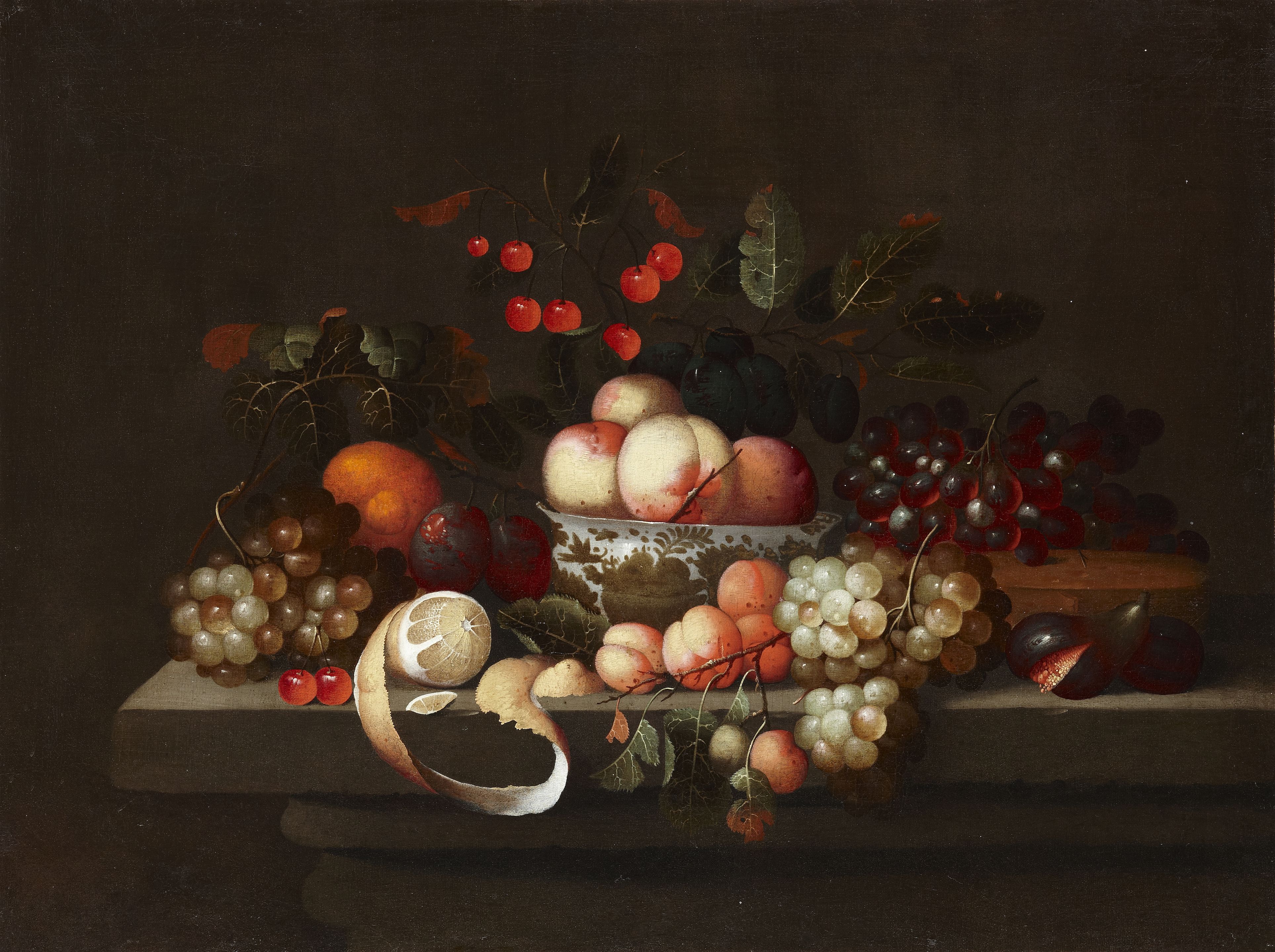 A bowl of peaches, with grapes, cherries, a peeled lemon, figs and other fruit on a stone ledge