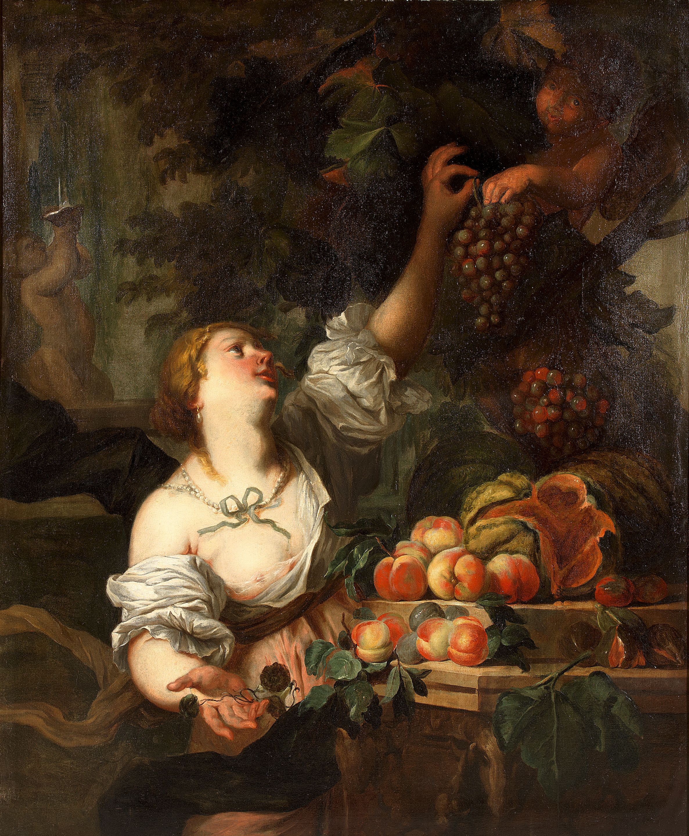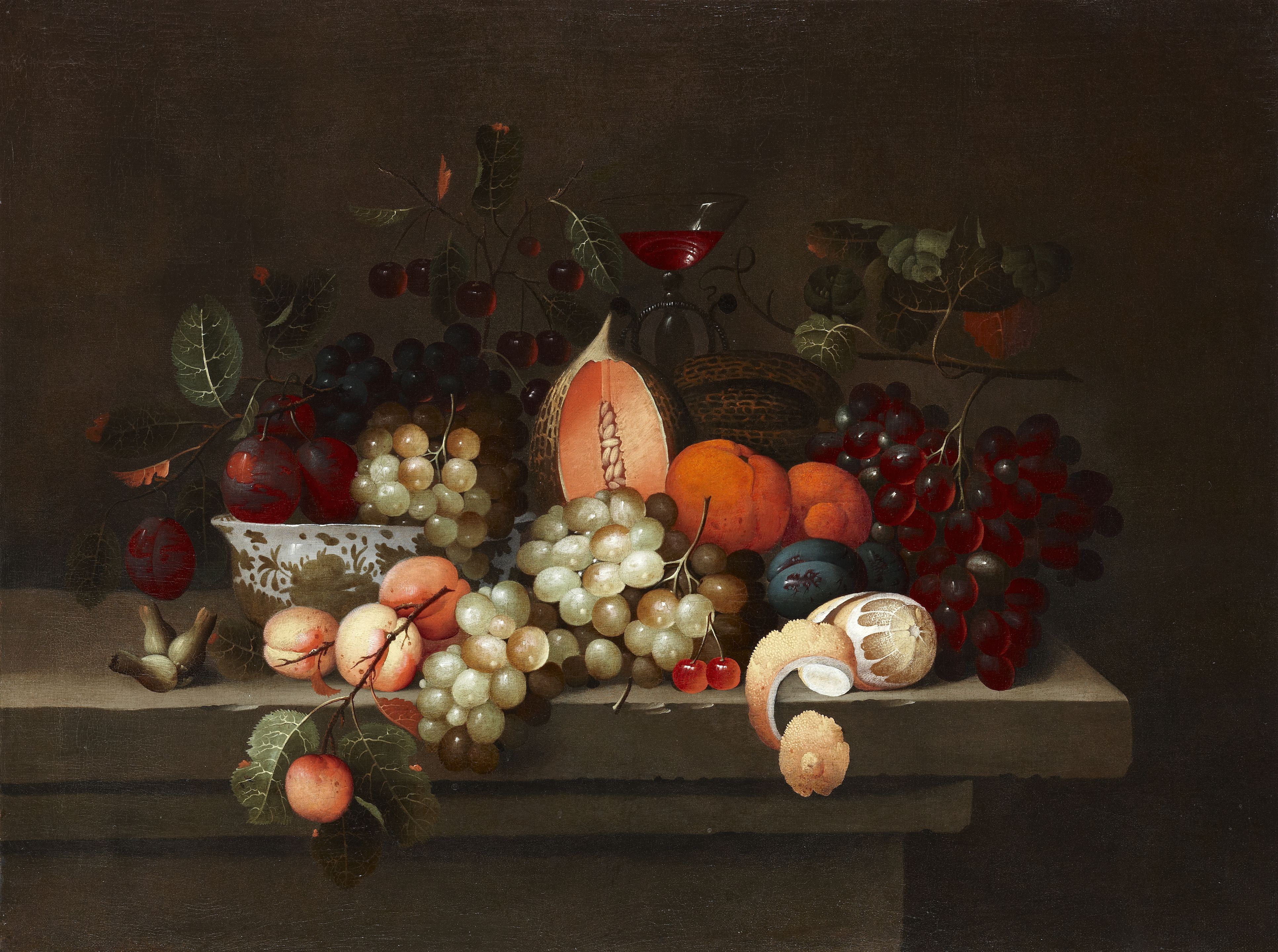 A still life of peaches and melons on a stone ledge with a lady holding a bunch of grapes