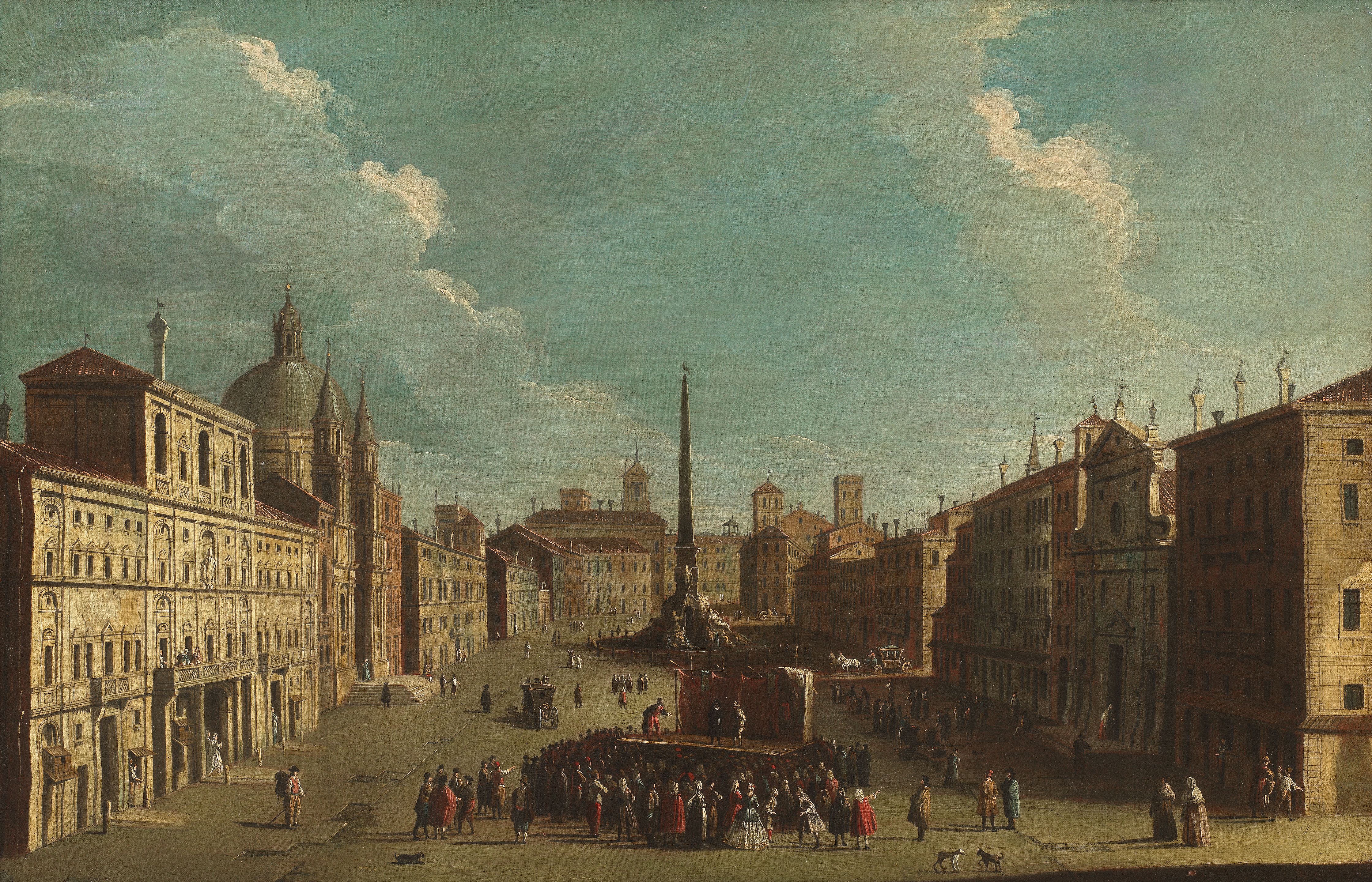 View of Piazza Navona, Rome, with a Commedia dell'Arte theatrical performance