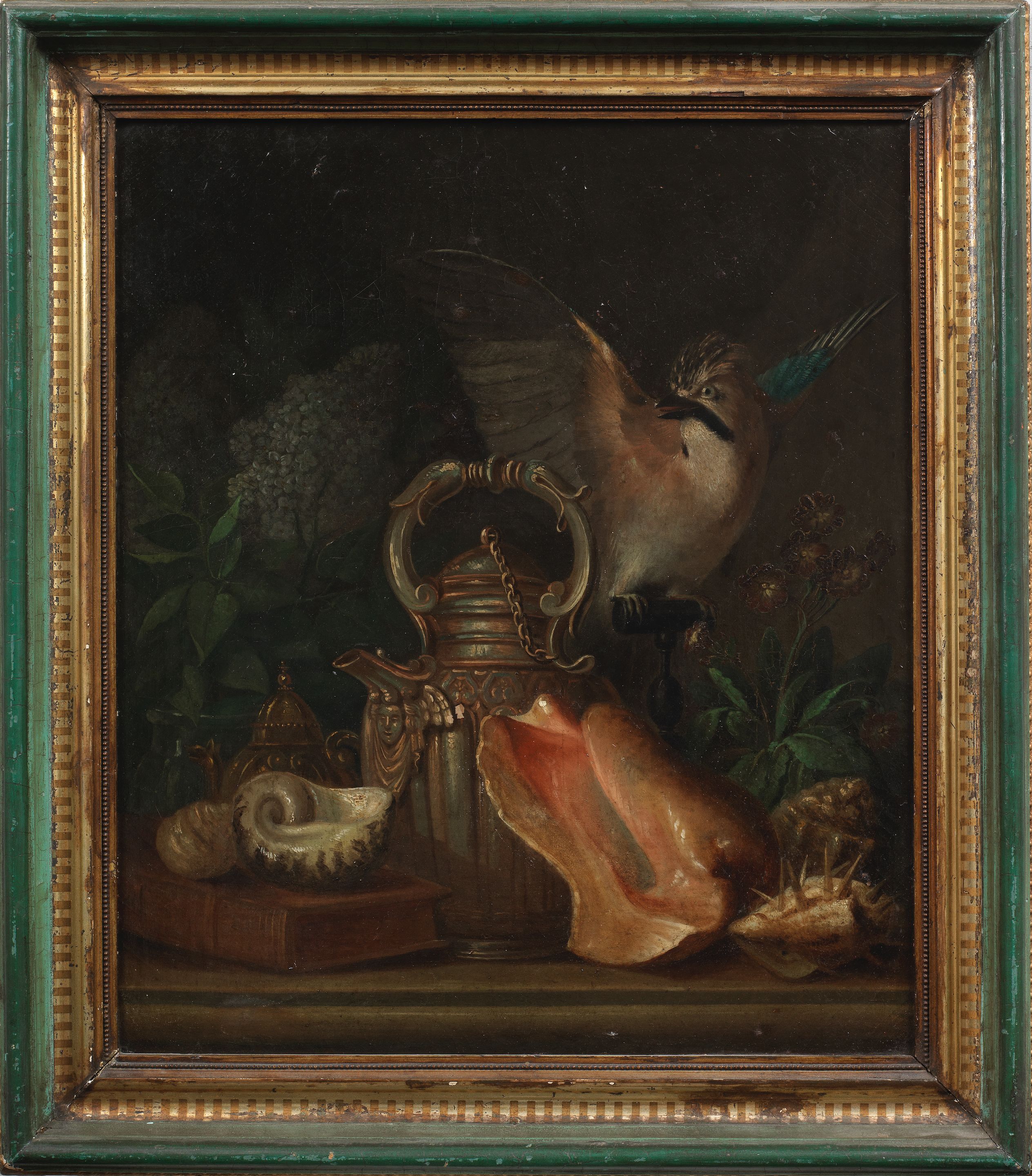 A still life of shells with books, a bunch of lilac, primulas and a Jay