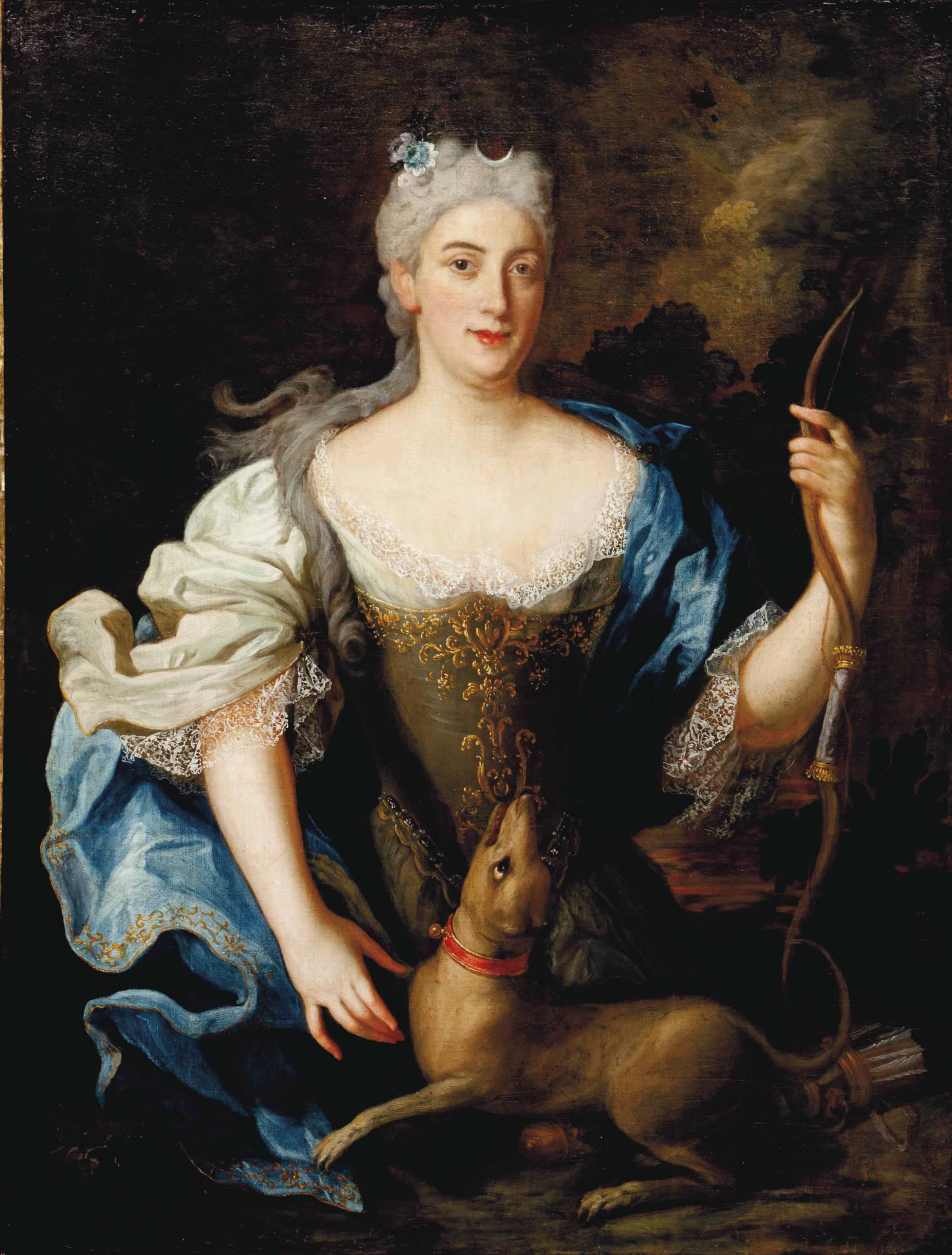 Portrait of a young lady as Diana, half-length, in a violet dress and pearl jewellery, holding a bow and quiver