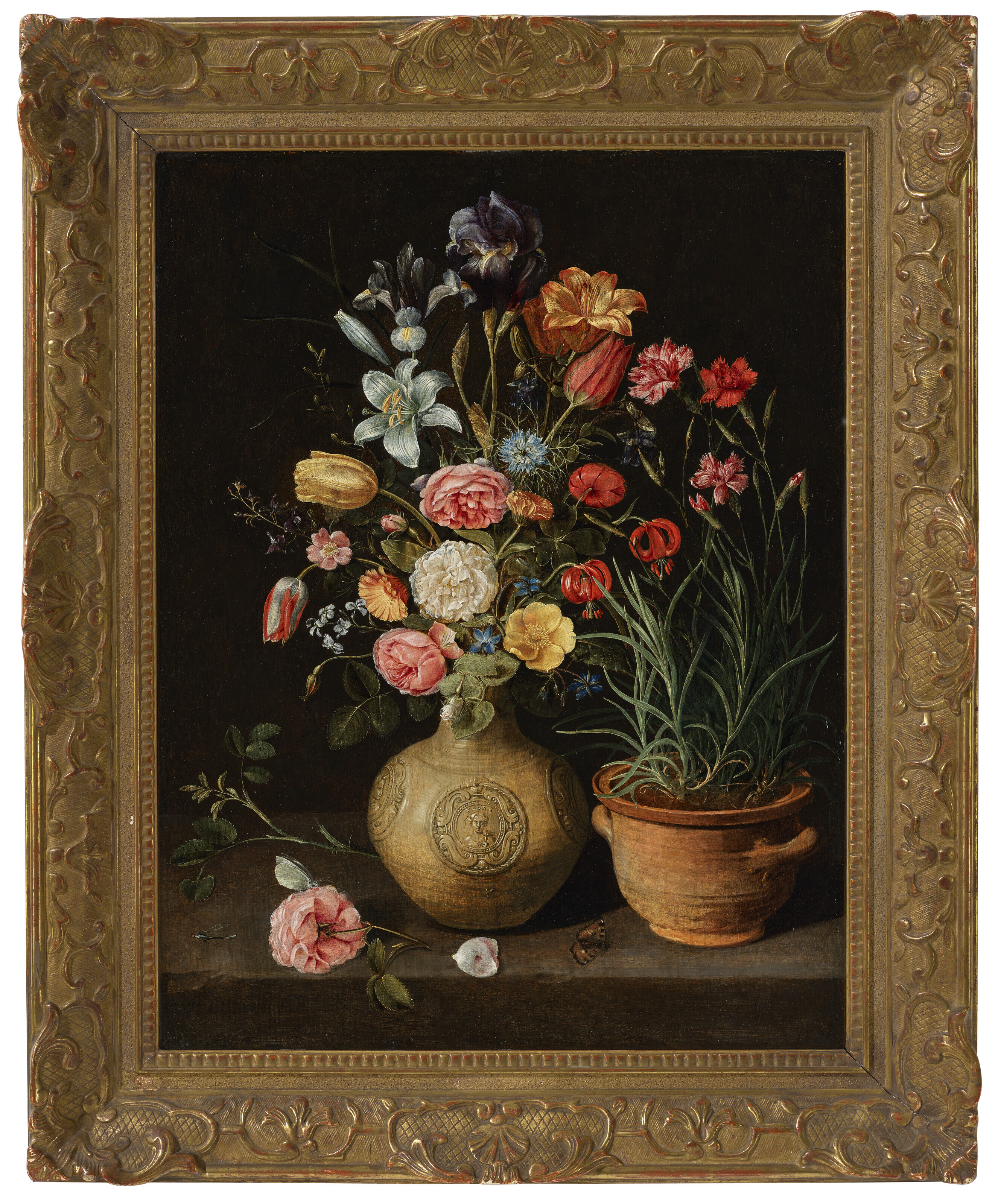 Roses, lilies, an iris and other flowers in an earthenware vase, with a pot of carnations and a butterfly on a ledge