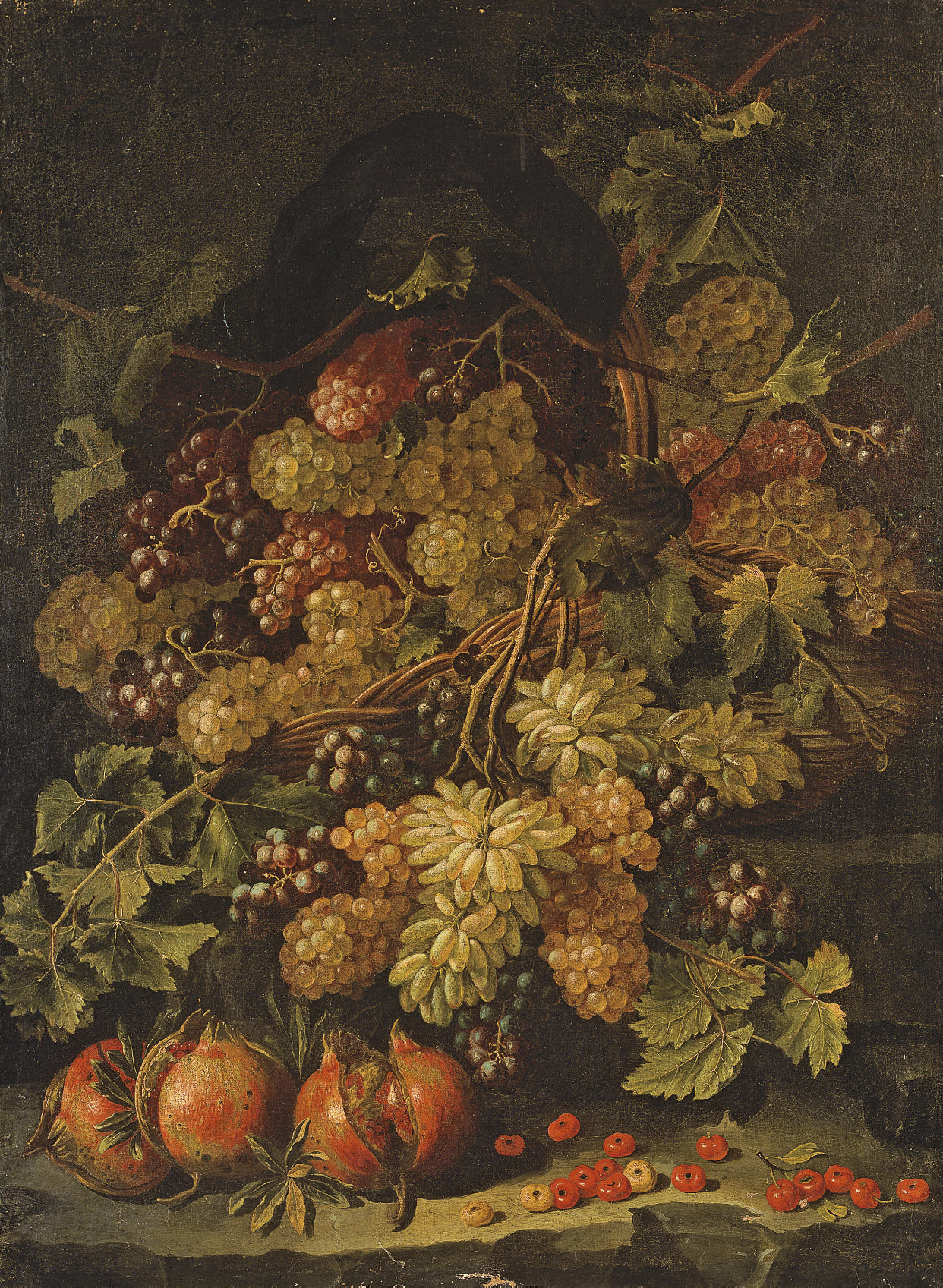 Raisins et grenades sur un entablement de pierre