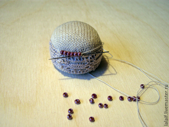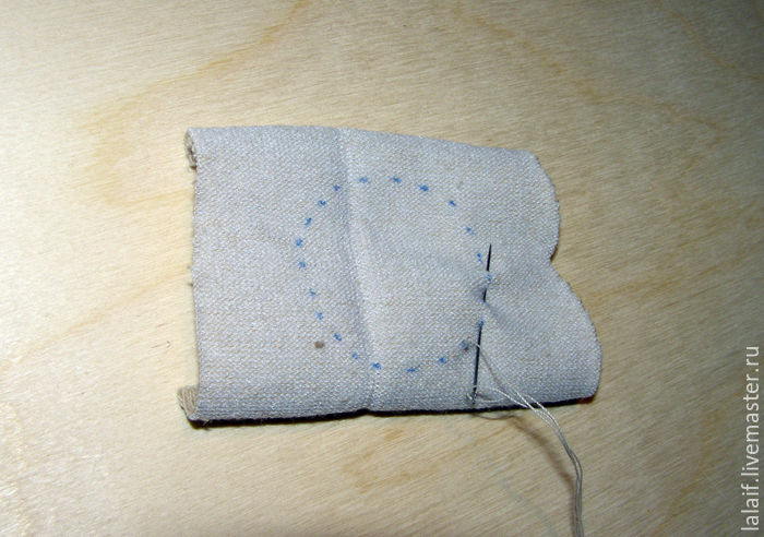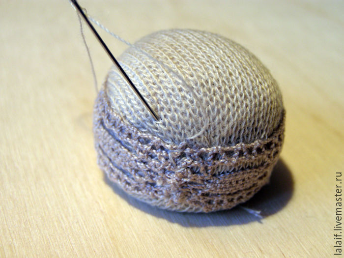 Стягивание лучше начинать с верхней части игольницы. Нитку не обрезайте. На этом этапе есть возможность прикрепить с помощью этой нитки маленькую игольницу. Когда будет стянута и нижняя часть большой игольницы, вы можете потайным швом получше пришить маленькую игольницу.