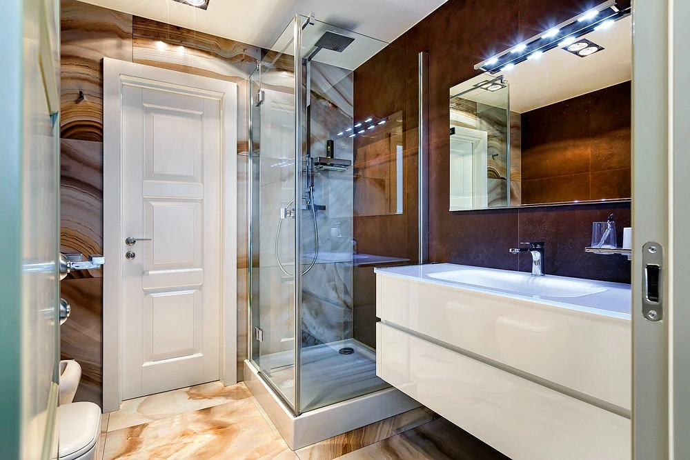 Сантехника: унитаз, биде Cielo, душевой отсек — стеклянная дверь, перегородка HSK, смесители, краны, душевая лейка Carlo Frattini |