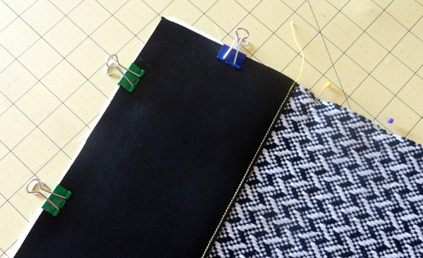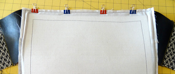 Шаг 2: Пришейте верхние передние и задние внешние части ткани к нижним передним и задним виниловым частям вдоль 16-дюймового края. Поскольку вы не можете использовать булавки на виниле, зажимы для переплета работают хорошо, чтобы удерживать ткань и винил на месте, просто удаляйте их, когда вы приближаетесь к ним с помощью иглы. Как только части сшиты вместе, прошейте сверху по винилу (на правой стороне ткани), чуть ниже шва. Для этого я использовал мою стежок в канаве и отрегулировал положение иглы сбоку. Это позволило мне провести ткань по прямой линии.