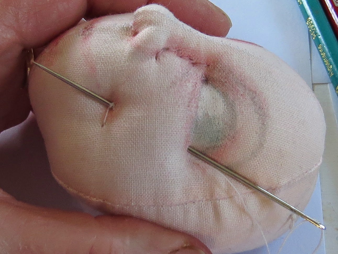 Возьмите stitchsideways и с иглой, действительно выкопать вниз в начинку, чтобы сделать хороший скулу. Выход на внешний угол глаза.