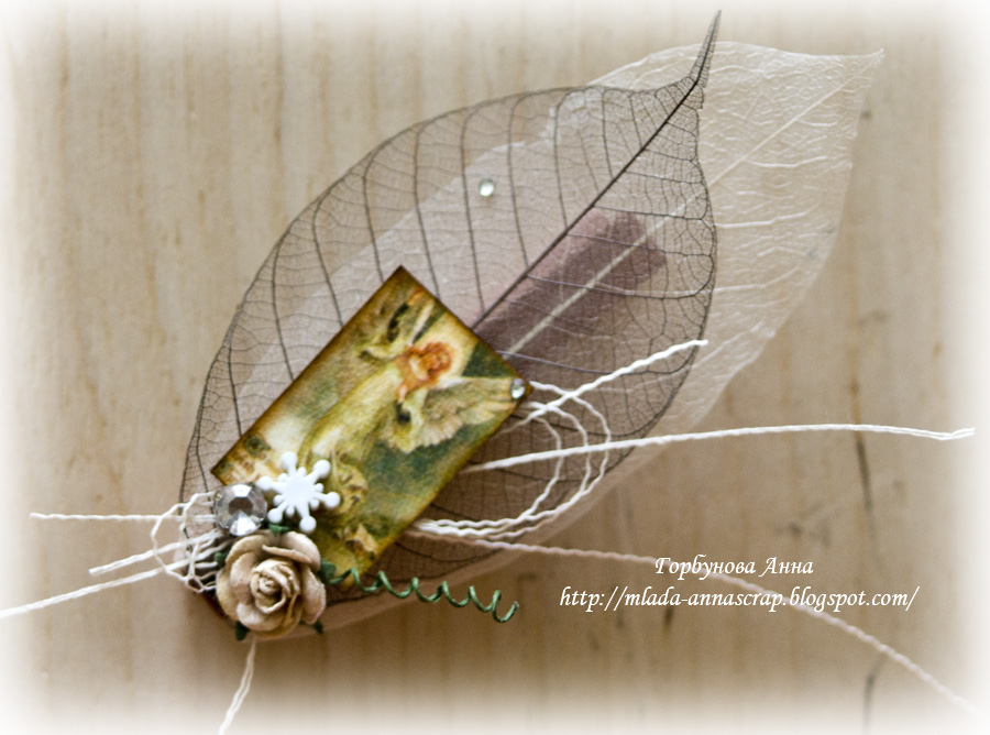 Прищепки я купила самые обыкновенные - деревянные (20 рублей за 12 штук), покрасила их акриловой краской и украсила. Для украшения использовала скелетированные листочки, скраповые цветочки, тесьму, немного стразиков (новый год все таки) и прочее.
