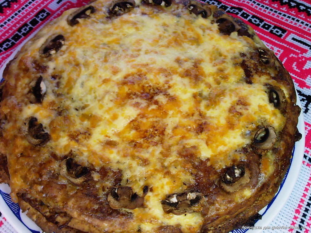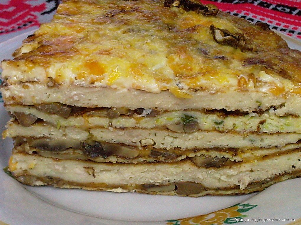 Кабачковый блин-грибы- сыр.тв- мясной блин-грибы- сыр-кабачковый блин ит.д Верхний мясной блин посыпать сыром ,смазать майонезом и запекать 10-15 мин в духовке.Приятного аппетита