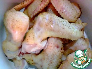 Три зубчика выдавливаем на промаринованные крылья и перемешиваем.