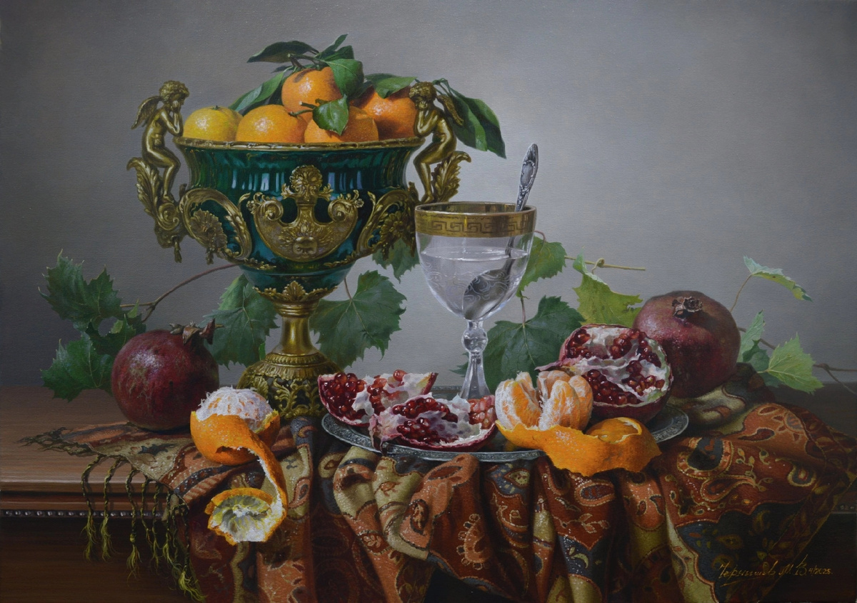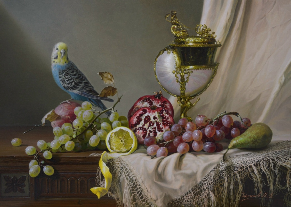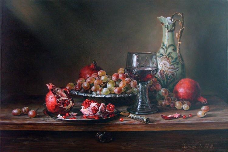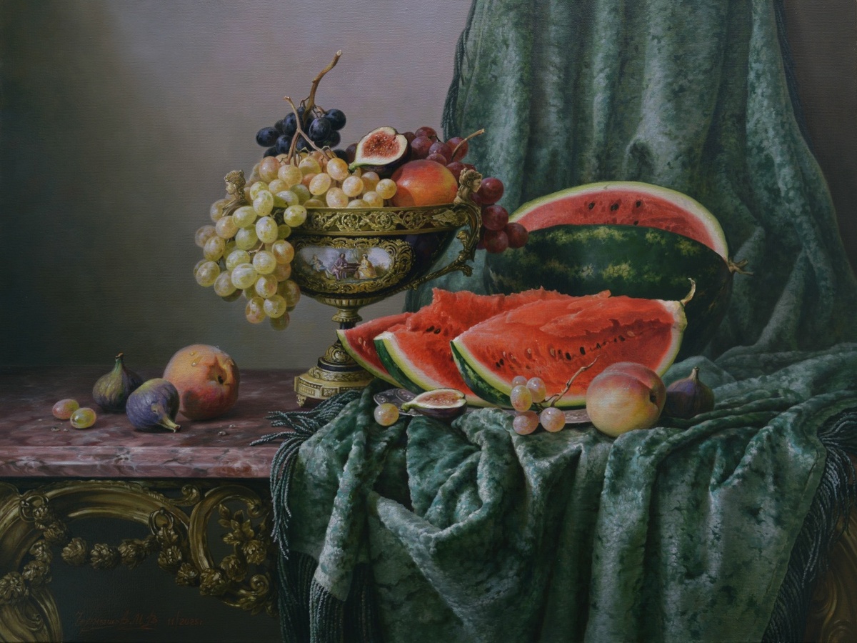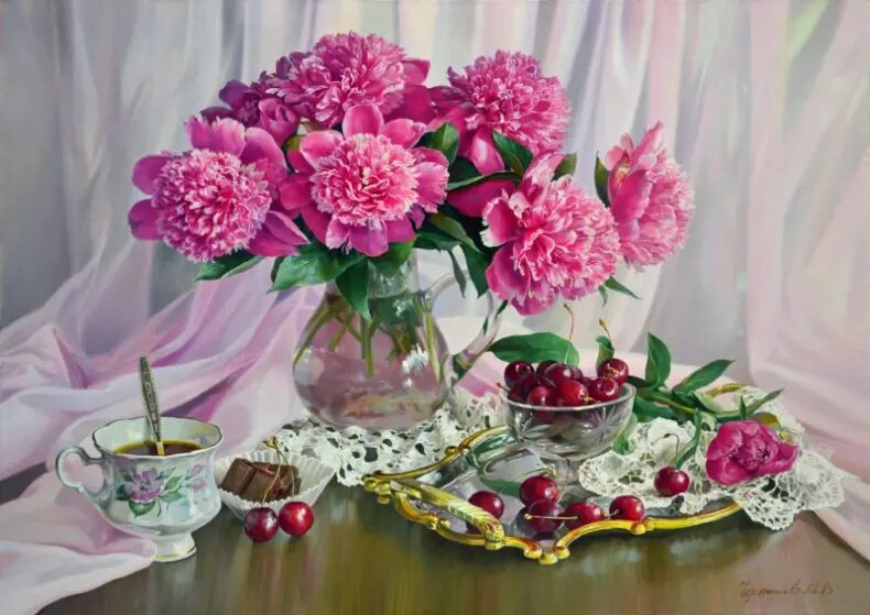 Великолепные картины живописца Михаила Васильевича Чернышова — это ода красоте, запечатлённая на холсте. Его натюрморты, наполненные фруктами, цветами и изысканными тканями, поражают своей детализацией и живостью. Каждая мельчайшая складка ткани и игра света на поверхности заставляют зрителя не просто созерцать, а буквально ощущать текстуру предметов, словно можно протянуть руку и коснуться их..