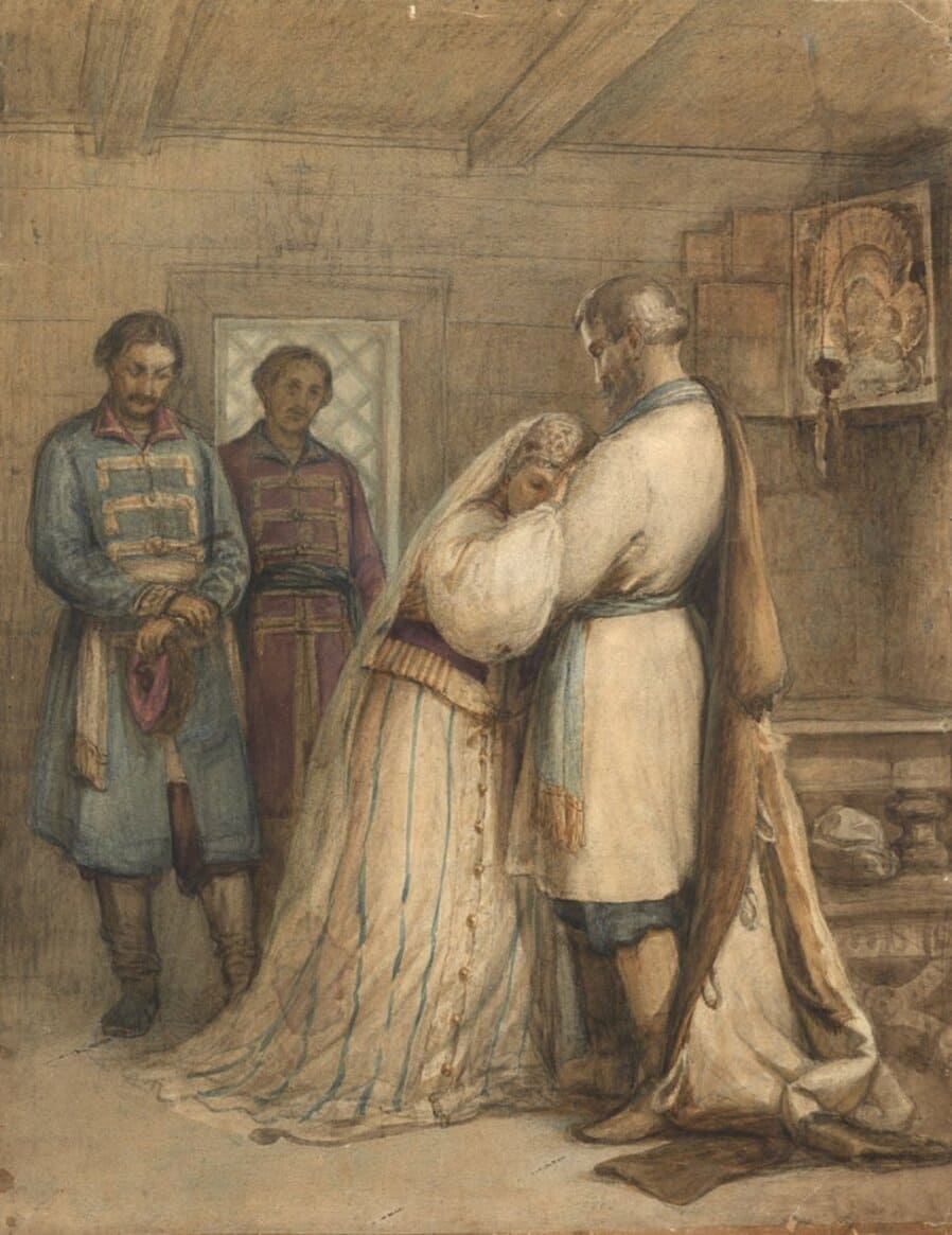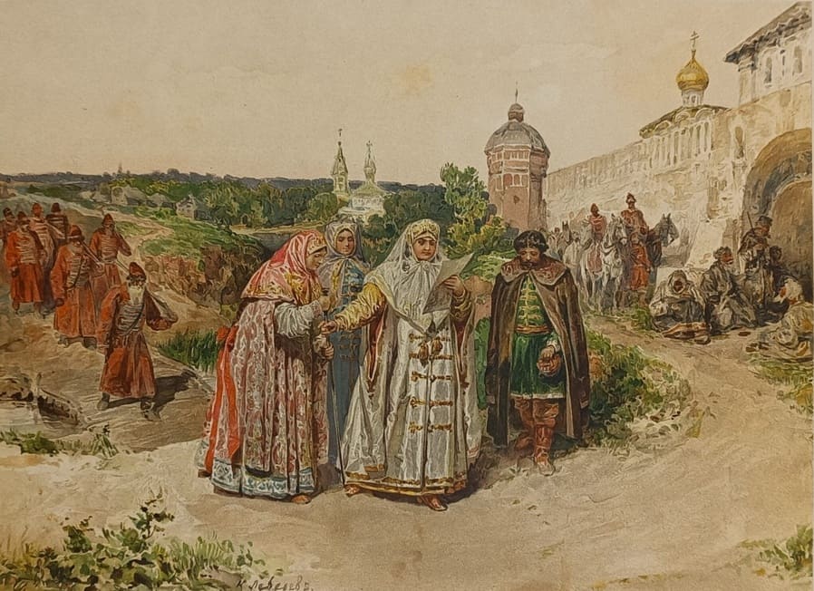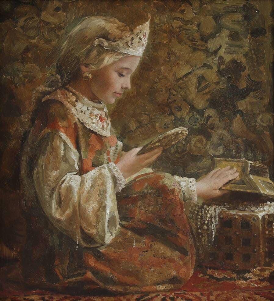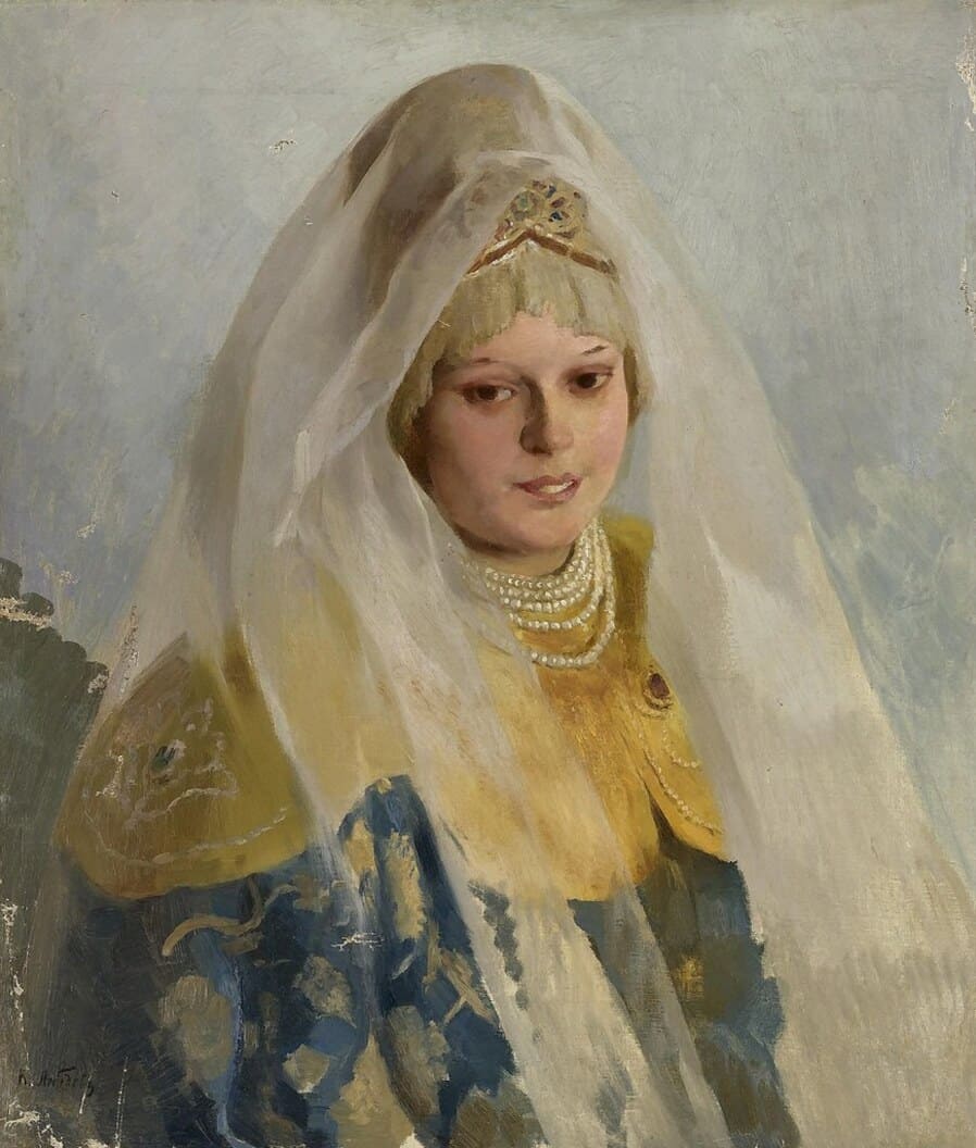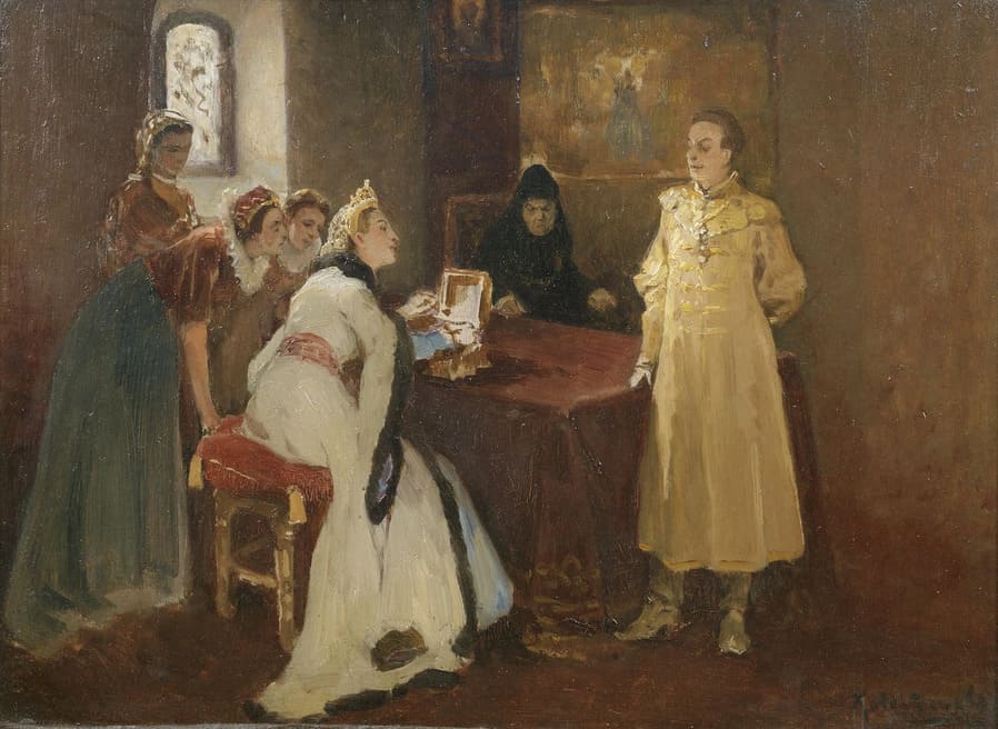 ЖанровоПортретноИсторическое 2 части - здесь Боярская свадьба, 1883, Третьяковская галерея Claudius Vasilievich Lebedev/Клавдий Васильевич Лебедев (Россия, 1852-1916) БоярышниАукционноМузейное (часть-3) 208 994 доллара США за картину «Боярина», проданную на аукционе Christie's Русская красавица, Как же хороша! Счастьем улыбается У тебя душа. Русская красавица, Нет тебя милей! Ищут – зря стараются, По земле по всей. Мысли твои ясные Миру не понять. Ты – жена прекрасная, И такая ж мать! Ты не вещь блестящая, Кукла – манекен, Душу настоящую Ближним даришь всем. Сердце твоё чистое, В нём корысти нет, Очи же лучистые Источают свет! Русская красавица, Будь всегда такой, Хоть врагу не нравится Стороны святой! (Владимир Садовник) Лебедев Клавдий Васильевич — русский художник исторического и бытового жанра, живописец религиозной тематики. Родился в 1852 году в крестьянской семье. Обучение живописи проходил в Строгановском училище и Московском училище живописи, ваяния и зодчества у Василия Григорьевича Перова и Евграфа Семеновича Сорокина. В 1881 году Лебедев был награжден большой серебряной медалью и получил звание классного художника третьей степени. Клавдий Васильевич Лебедев писал свои картины в жанре историческом и бытовом, создавал произведения в духе реализма на современные темы и темы русской истории X-XVII столетий. Оставил большое наследие в виде исторических полотен и акварелей со сценами из "домашнего быта" княжеской и боярской Руси. С 1877 года Лебедев участвовал в выставках Московского училища живописи, ваяния и зодчества, Петербургской Академии Художеств, Товарищества передвижников. С 1891 года Клавдий Лебедев стал действующим членом художественного объединения Товарищества передвижных художественных выставок. В 1893 году принимал участие во Всемирной художественной выставке в Чикаго. В 1897 году Клавдий Лебедев был удостоен звания академика живописи, в 1906 году избран действительным членом Академии художеств. Ксения Годунова и Лжедмитрий Лебедев очень много работал по теме церковной и религиозной живописи. Клавдий Васильевич Лебедев создал иконы для иконостаса болгарской церкви Святого Стефана в Стамбуле. Совместно с художником Алексеем Ивановичем Корзухиным Лебедев расписывал Вознесенский собор в городе Елец. Более ста созданных художником эскизов и рисунков хранятся в собрании церковно-археологического кабинета Московской духовной академии. Оригинальные акварели и рисунки Лебедева также хранятся в музее истории религии. В 1894-1898 годах преподавал в Академии Художеств в Санкт-Петербурге в должности профессора натурного класса, с 1890 года преподавал в Московском училище живописи, ваяния и зодчества. В начале XX века Лебедев иллюстрировал Библию картинами по Священной истории Ветхого Завета. Иллюстрировал русские сказки, сотрудничал с журналами "Живописное обозрение", "Всемирная иллюстрация", "Нива". Участвовал в иллюстрации книги "Великокняжеская, царская и императорская охота на Руси". Был штатным художником издательства Ивана Дмитриевича Сытина. Лебедев Клавдий Васильевич скончался в 1916 году в Москве. Работы Клаудии Лебедева неоднократно выставлялись на аукционах, при этом цены варьировались от 2160 до 208 994 долларов США в зависимости от размера и техники исполнения произведения. С 2004 года рекордная цена за работу этого художника на аукционе со