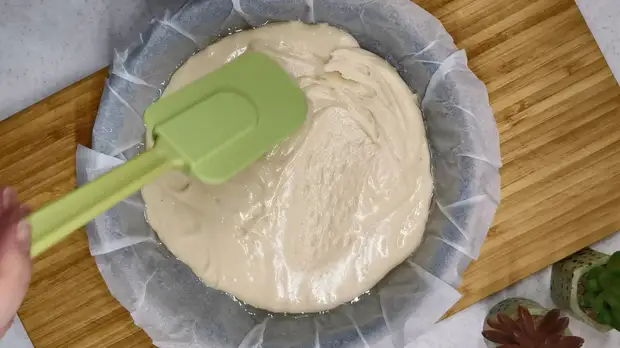Перекладываем тесто в форму для запекания и разравниваем поверхность лопаточкой. Форму можно взять любую, но в металлической печется быстрее всего. Обязательно застилаем её пекарской бумагой. И бумагу смазываем растительным маслом.