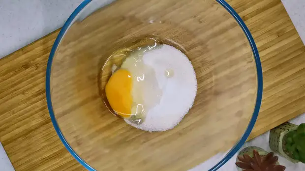 Берем удобную глубокую ёмкость и всыпаем в неё обычный и ванильный сахар. Добавляем одно яйцо и взбиваем все это около 1 минуты до растворения сахарных крупинок и изменения цвета на практически белый.