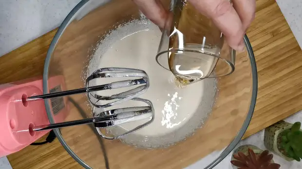 А добавляем мы теперь растительное масло и молоко. В принципе можно взять и растопленное сливочное масло или даже маргарин. Но с растительным пирог получается гораздо легче и воздушнее. Добавили и снова взбиваем 1 минуту, просто до однородной пышной массы.