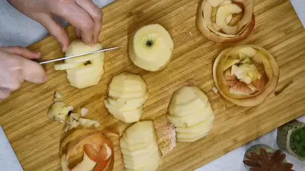 Яблоки чистим от шкурки. Она точно не нужна. Вырезаем сердцевинки с косточками. Разрезаем каждое яблоко пополам. А затем половинки режем пластинами поперек. Стараемся сделать так, чтобы половинка яблока не рассыпалась, а создавала впечатление, что она не разрезана на части.
