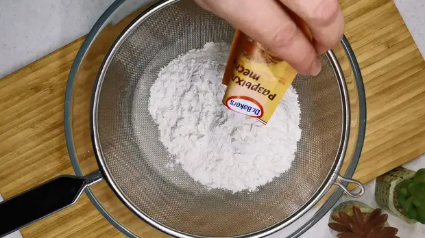 Теперь очередь муки. Муку смешиваем с разрыхлителем и просеиваем в нашу пышную яично-сахарную массу. Миксер больше не нужен. На этот раз всё просто перемешиваем обычным венчиком до однородности.