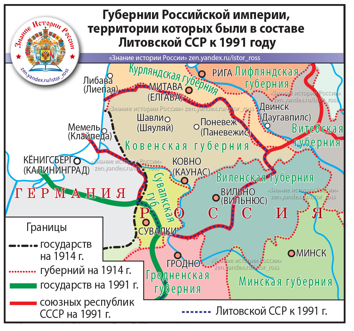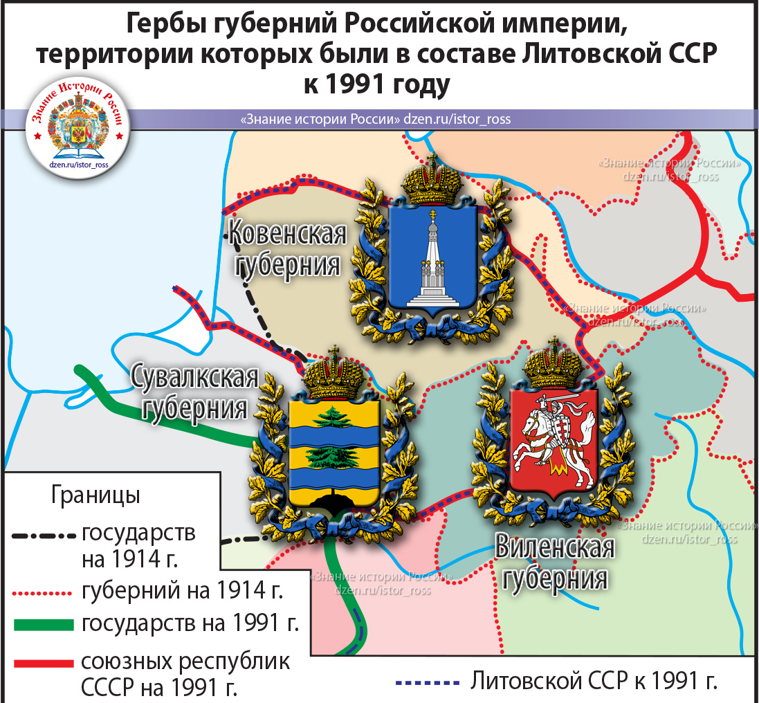 Картосхема "Губернии Российской империи, территории которых были в составе Литовской ССР к 1991 году". Коллаж «Знание истории России» https://dzen.ru/istor_ross