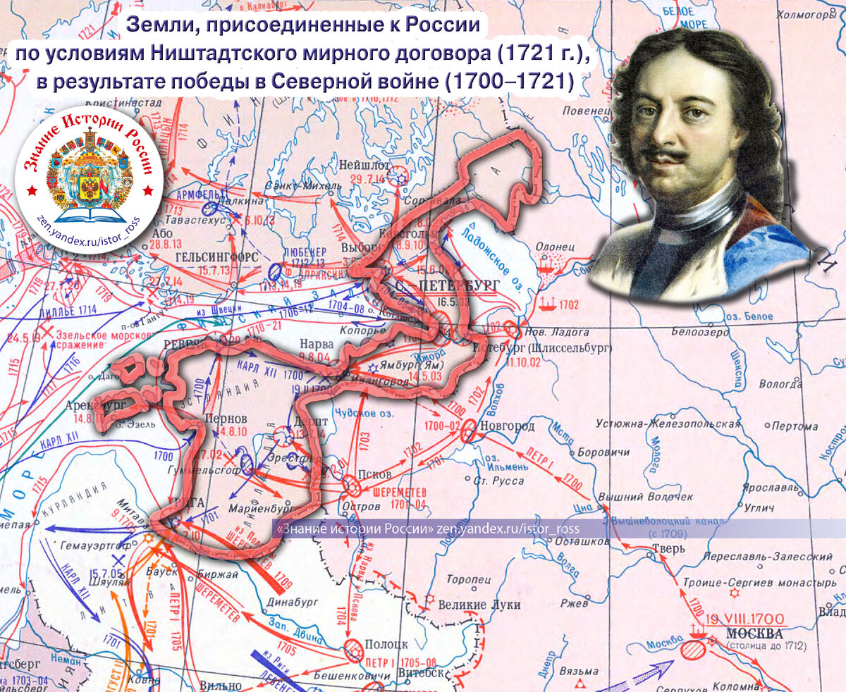 Коллаж "Земли, присоединенные к России по условиям Ништадтского мирного договора (1721 г.), в результате победы в Северной войне (1700–1721)". Канал "Знание истории России". https://zen.yandex.ru/istor_ross