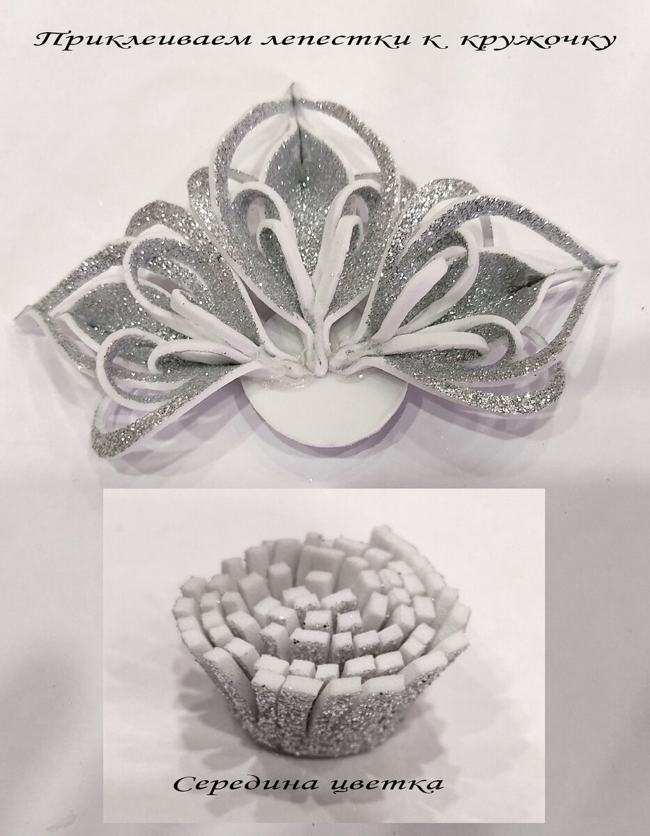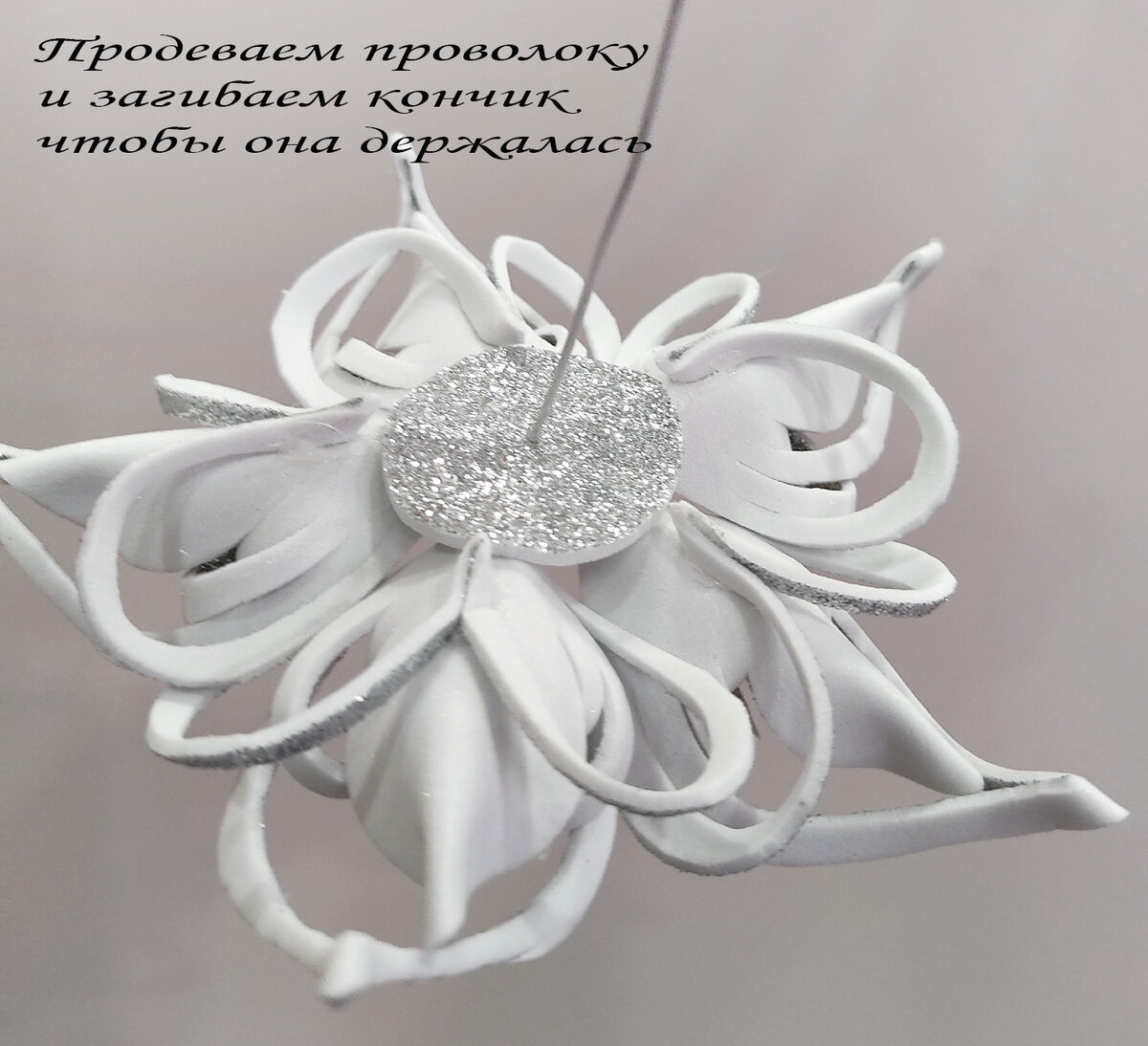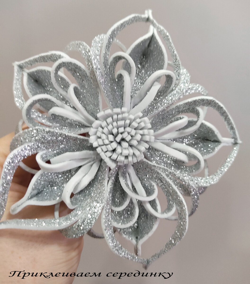 Лепестки приклеиваем к кружочку, блестки вниз. Полоску промазываем клеем ( в области где надрезов нет, внизу) и скручиваем. Продеваем проволоку и загибаем чтобы она держалась. Ей цветок будет крепиться к елке. Можно заменить зажимом, которые продаются для изготовления заколок.