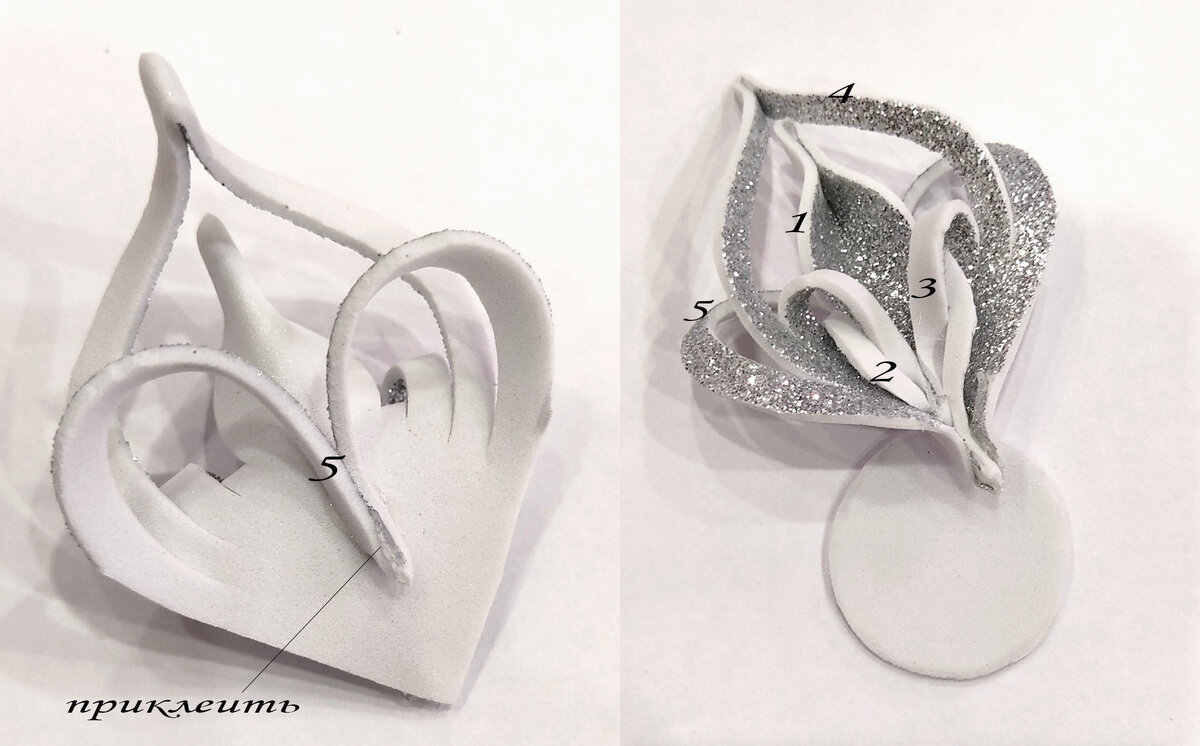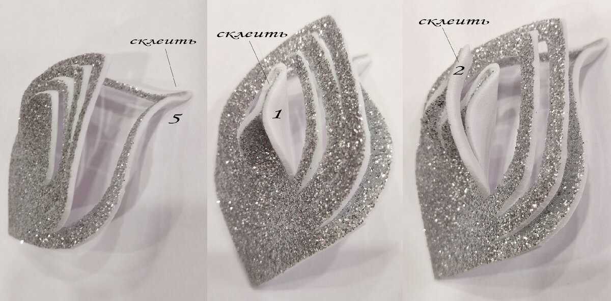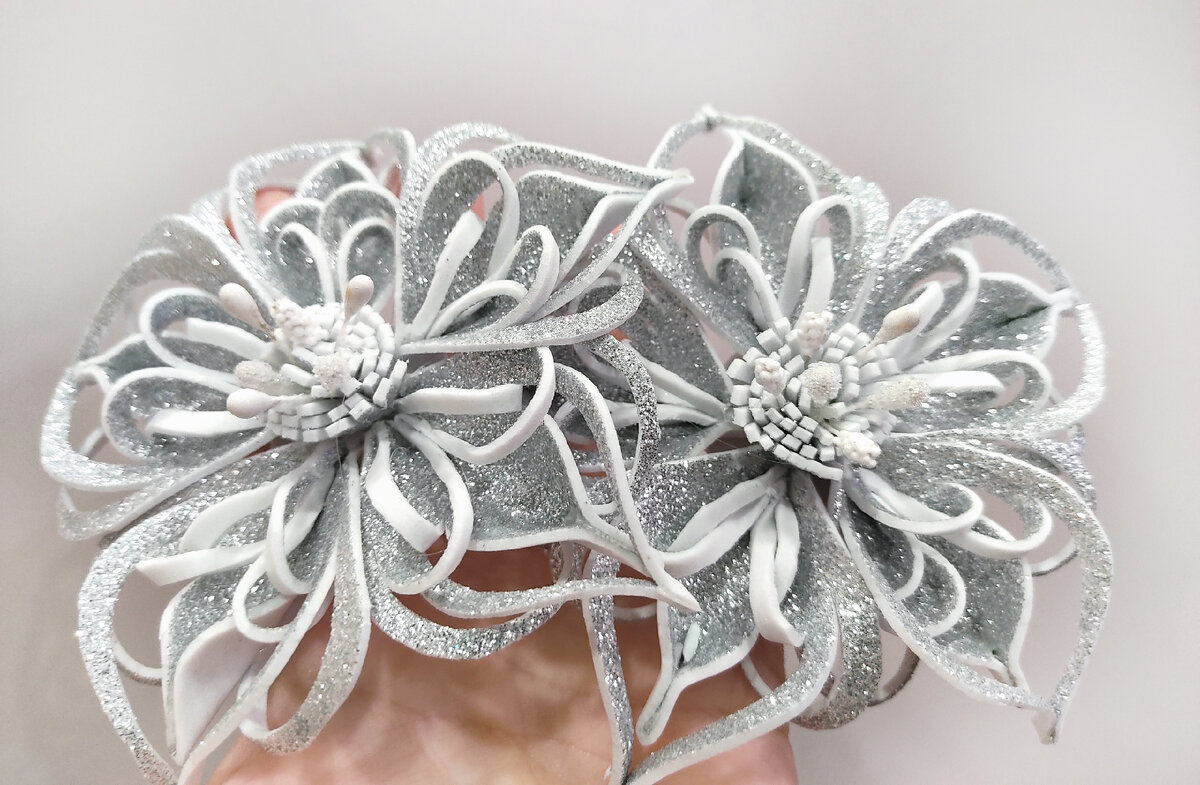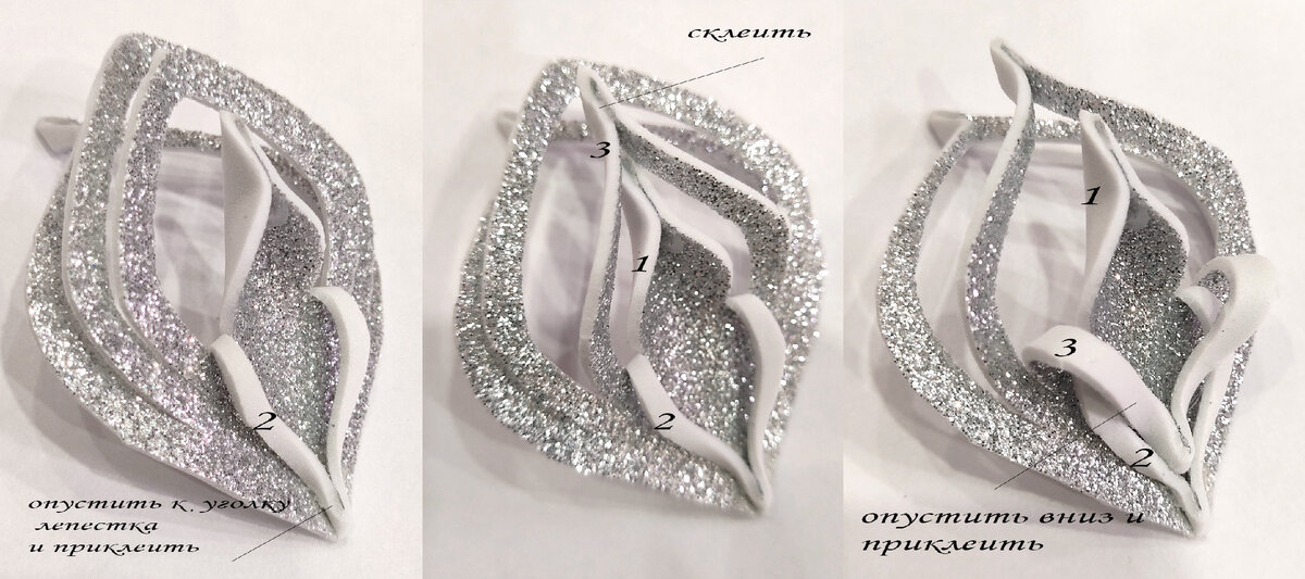 Лепестки приклеиваем к кружочку, блестки вниз. Полоску промазываем клеем ( в области где надрезов нет, внизу) и скручиваем. Продеваем проволоку и загибаем чтобы она держалась. Ей цветок будет крепиться к елке. Можно заменить зажимом, которые продаются для изготовления заколок.