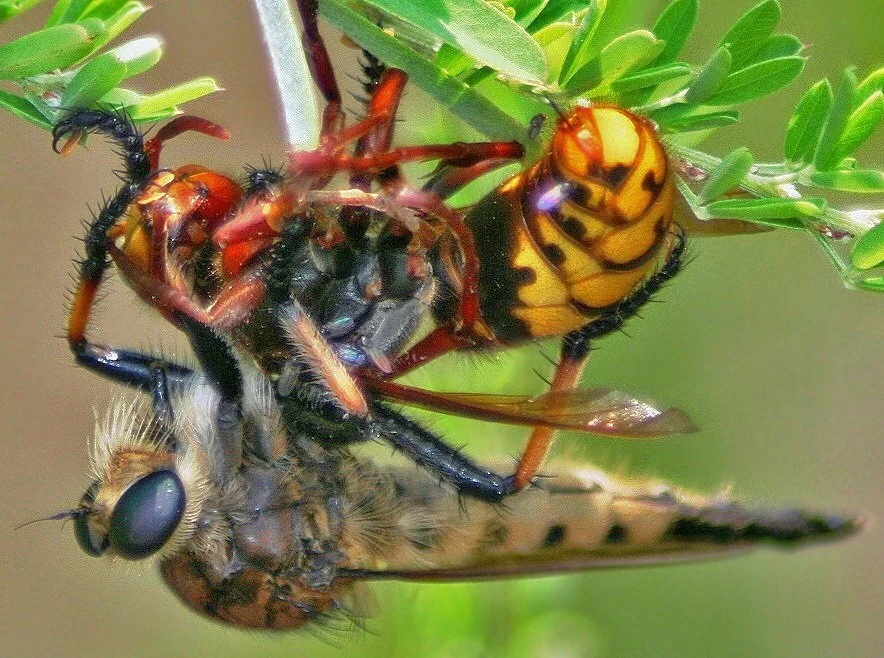 Шершни и сами являются добычей. Здесь мы видим, как он попался в лапы гигантскому ктырю — элите членистоногой авиации.