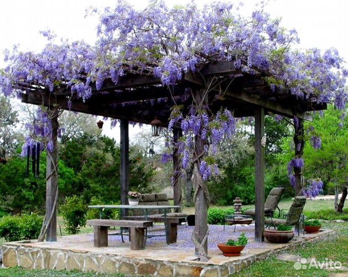 Это растение идеально подходит для украшения наружных стен домов, пергол и беседок, создавая живописные зелёные композиции и затеняя пространство в жаркие дни. Благодаря своей гибкости и пластичности, глициния легко принимает нужную форму и может быть направлена в любом направлении. Она не требовательна к температурным условиям, выдерживая морозы до −35 ∘C и высокие температуры, что делает её пригодной для выращивания в разных регионах. Однако в особо суровые зимы молодые растения всё же стоит укрывать, чтобы защитить их от вымерзания. В регионах с мягким климатом глициния прекрасно зимует без укрытия, сохраняя жизнеспособность даже при значительных понижениях температуры.