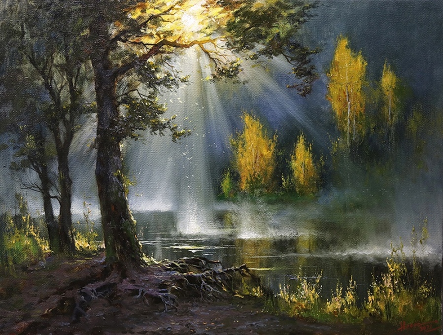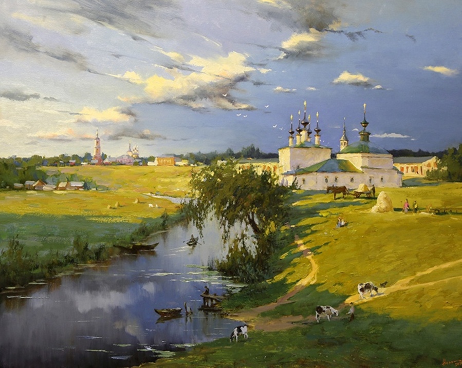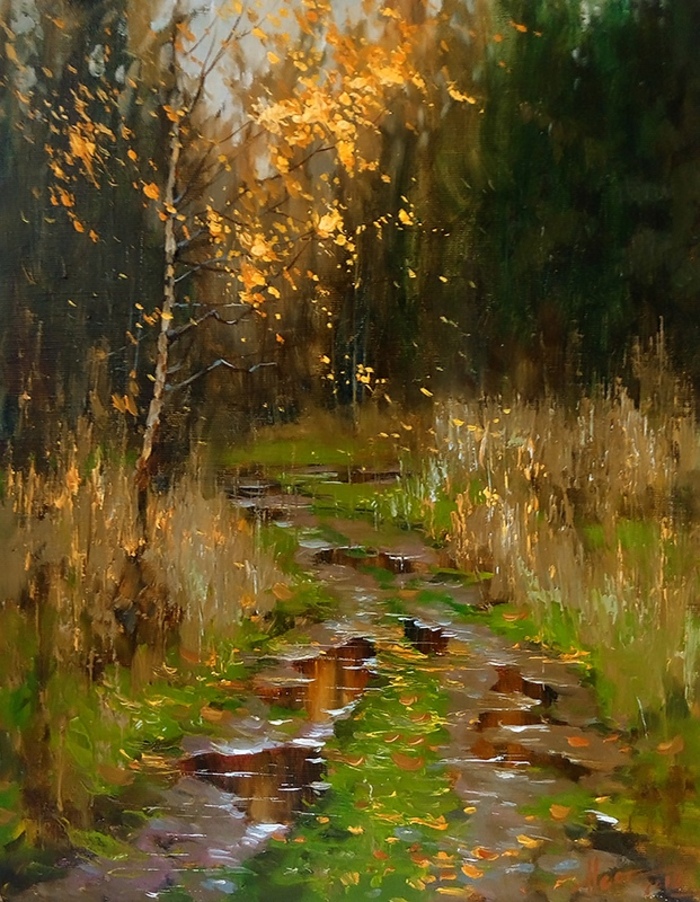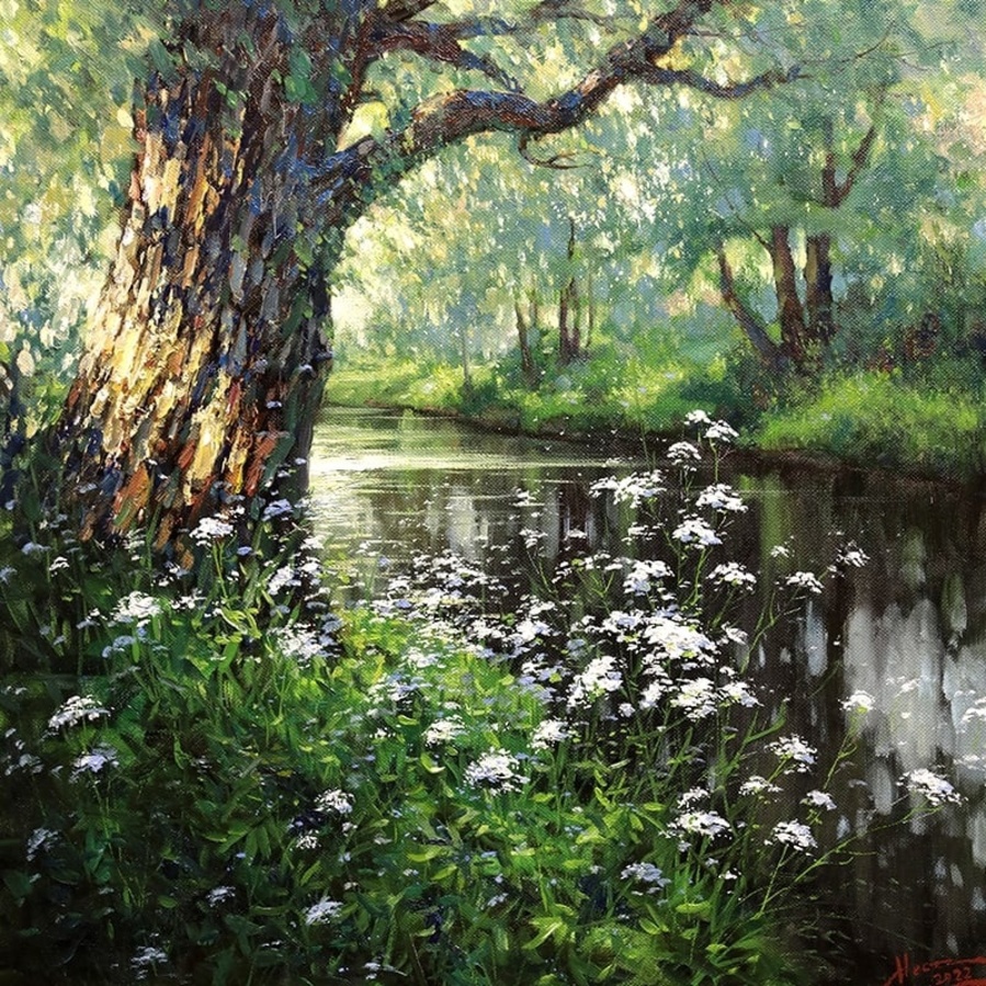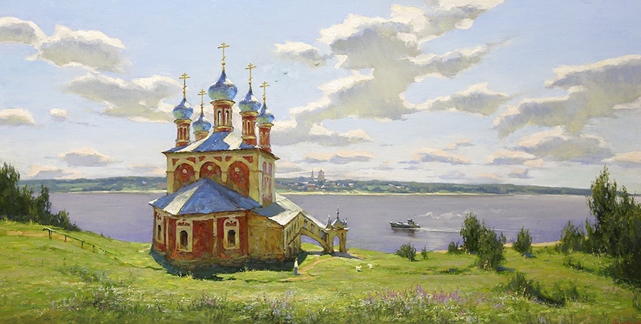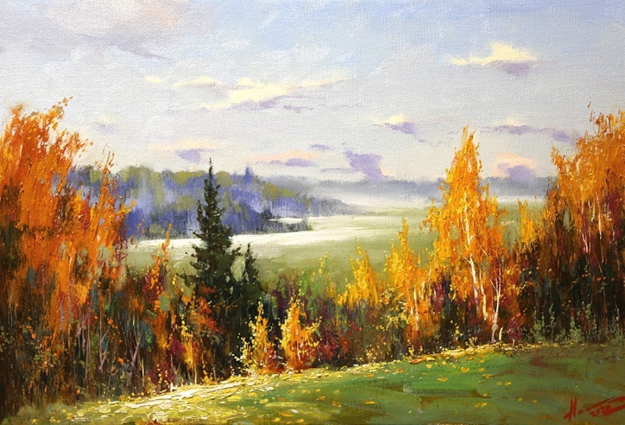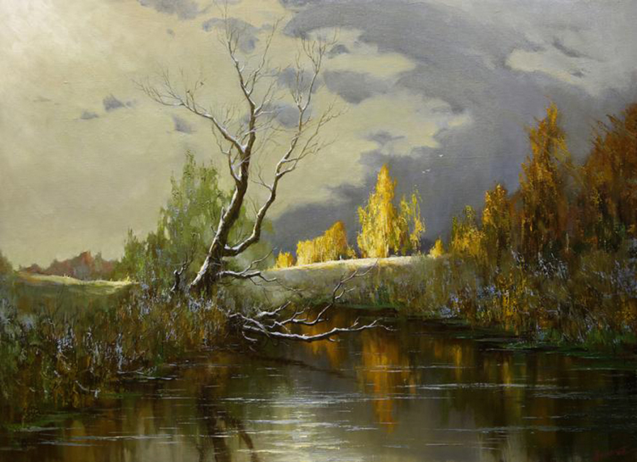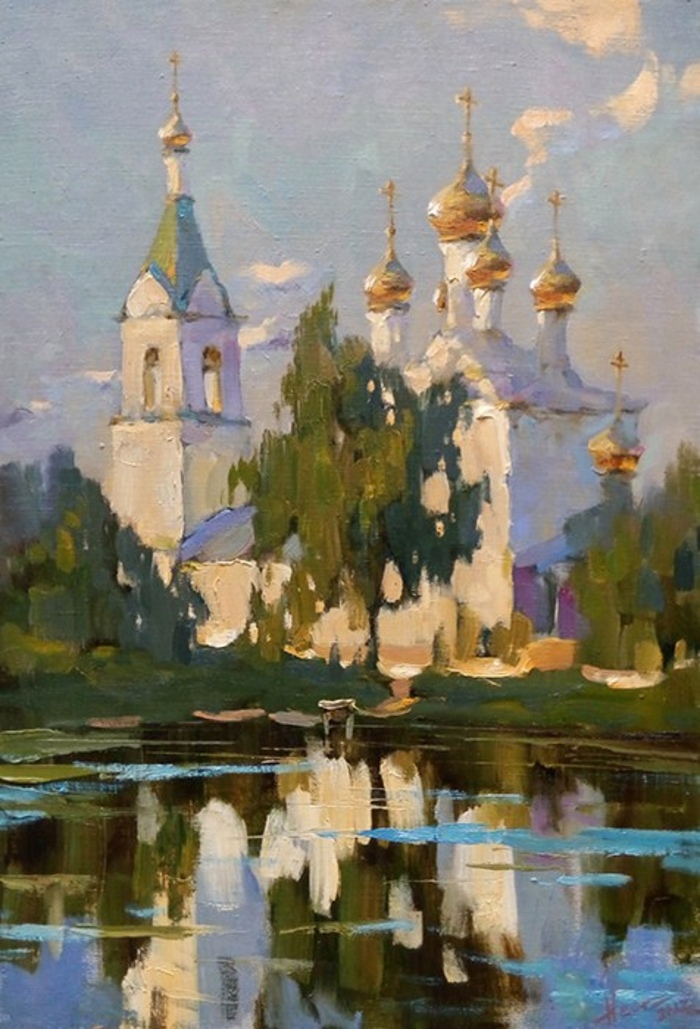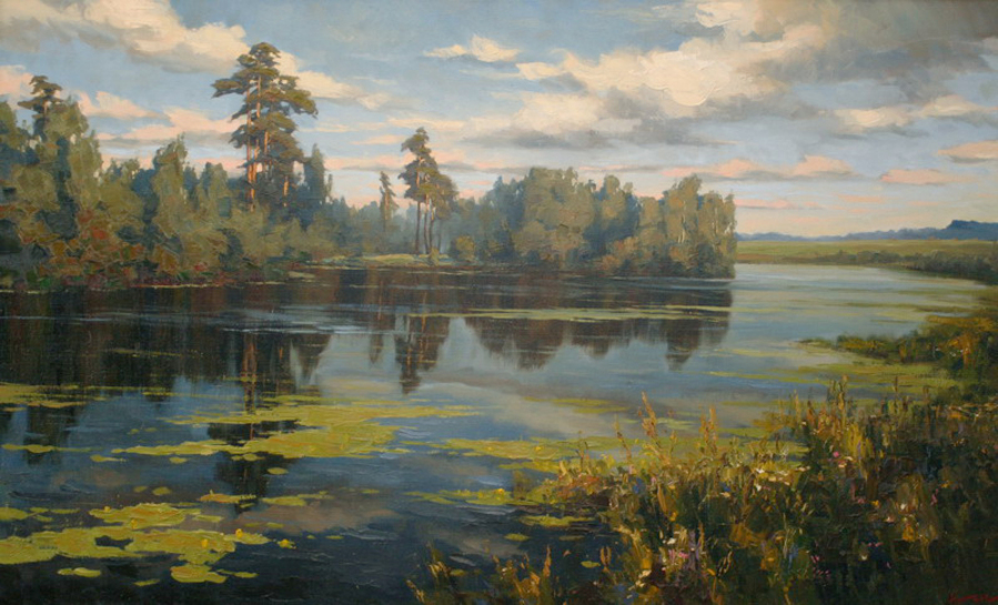На своих полотнах он создает поэтическую и лирическую картину русской природы, постоянно учится у таких мастеров реалистической пейзажной живописи, как И.Левитан, А.Саврасов, Ф.Васильев.