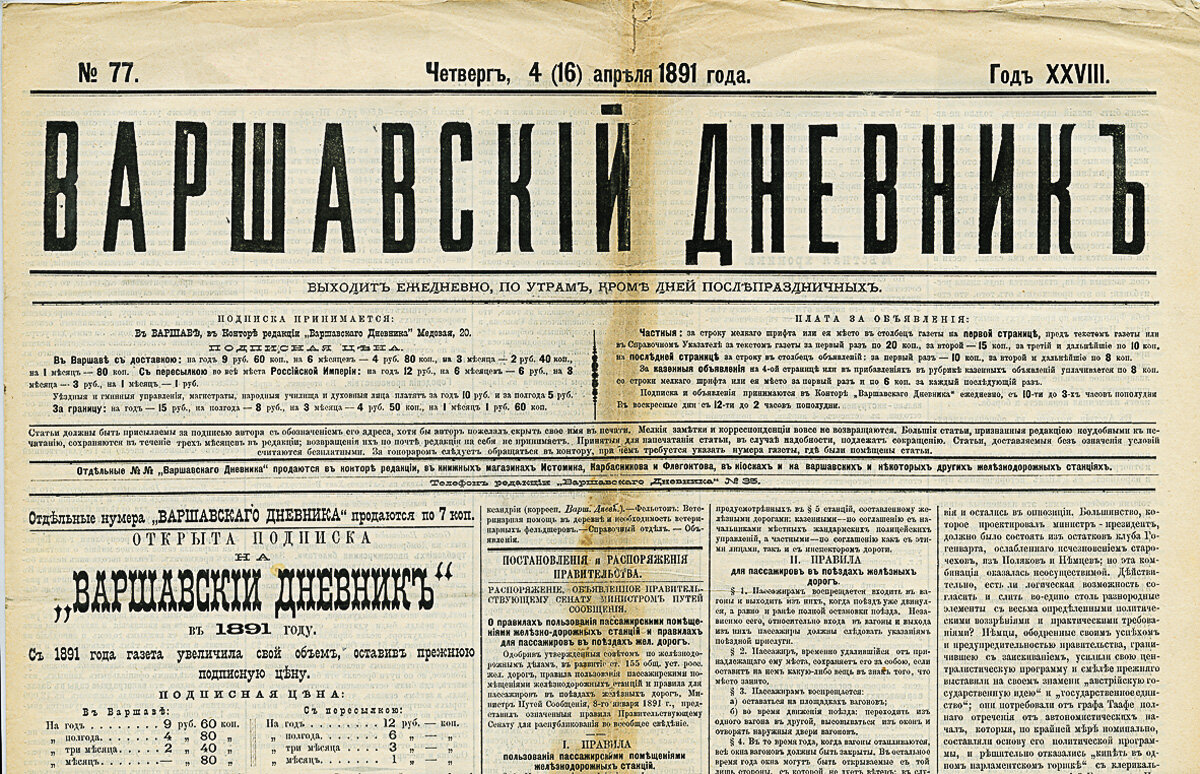 Номер газеты "Варшавский дневник" от 4 апреля 1891 года. С 1892 года В.В. Крестовский редактировал это издание