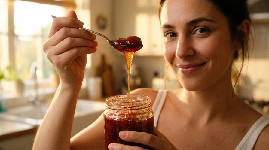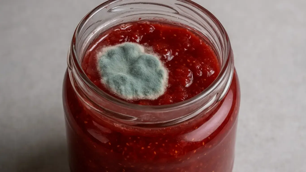 Плесневые грибы — особая каста: некоторые виды, например Xeromyces bisporus, выживают при активности воды 0,61, что ниже любого варенья (но выше мёда, поэтому он не плесневеет!). Но главная причина проще — нарушенная герметичность крышки: влага из воздуха конденсируется на поверхности сиропа, локально разбавляет его, и в этом тонком слое активность воды поднимается выше критической отметки 0,70–0,75. Плесень не проникает через весь объём банки — она селится именно там, сверху, где защитный барьер сломан.