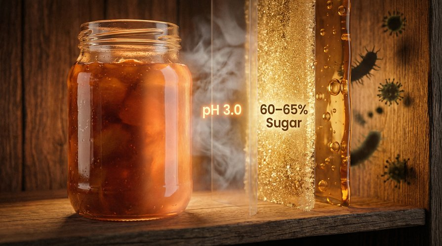 Сахар — главный, но не единственный защитник варенья. В пищевой науке это называют барьерной технологией: продукт защищают не одним мощным ударом, а несколькими средними, бьющими одновременно с разных сторон.