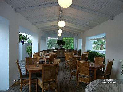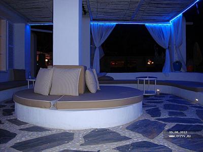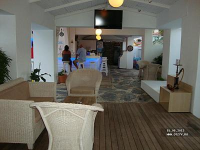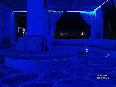 Хотите сидите в баре, хотите сядьте за столики у бара и поиграйте в нарды, хотите поиграйте в дартс, а можно посидеть у бассейна на сидячих шезлонгах или пообщаться в отделенном каменной кладке от других столиков гротике, или пойти попить чего-нибудь прохладительного на подсвеченной синим террасе, возлежа на подушках как турецкий паша, или расположиться на шезлонгах чувствуя под ногами прохладную влажную травку. А можно оправиться в лобби и устроится в большом уютном кресле с книжкой (там кстати есть книжки и на русском). Или остаться после ужина в уютном ресторанчике наверху, попивая пиво с креветками или вино с фруктами....